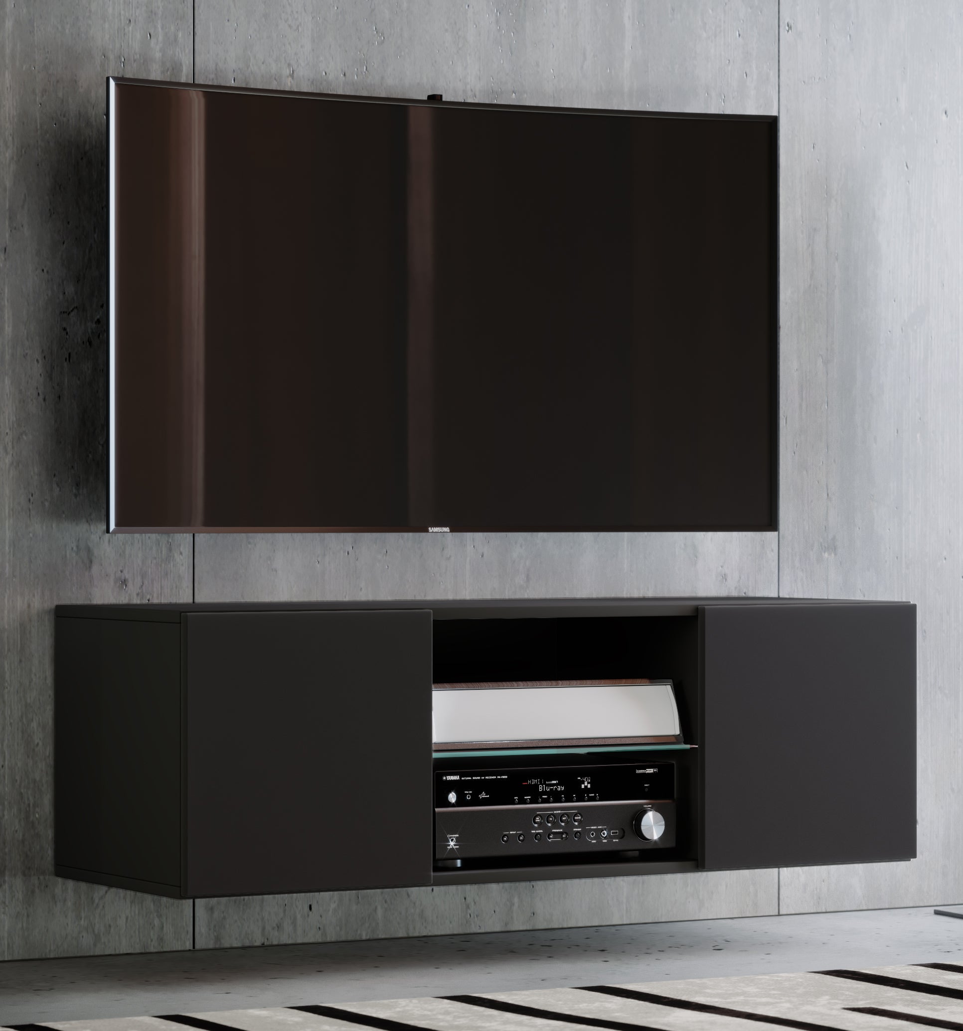 - 1 x Jusa 115 TV-meubels wandmodel met 2 deuren en 1 glazen legger, Zwart.
