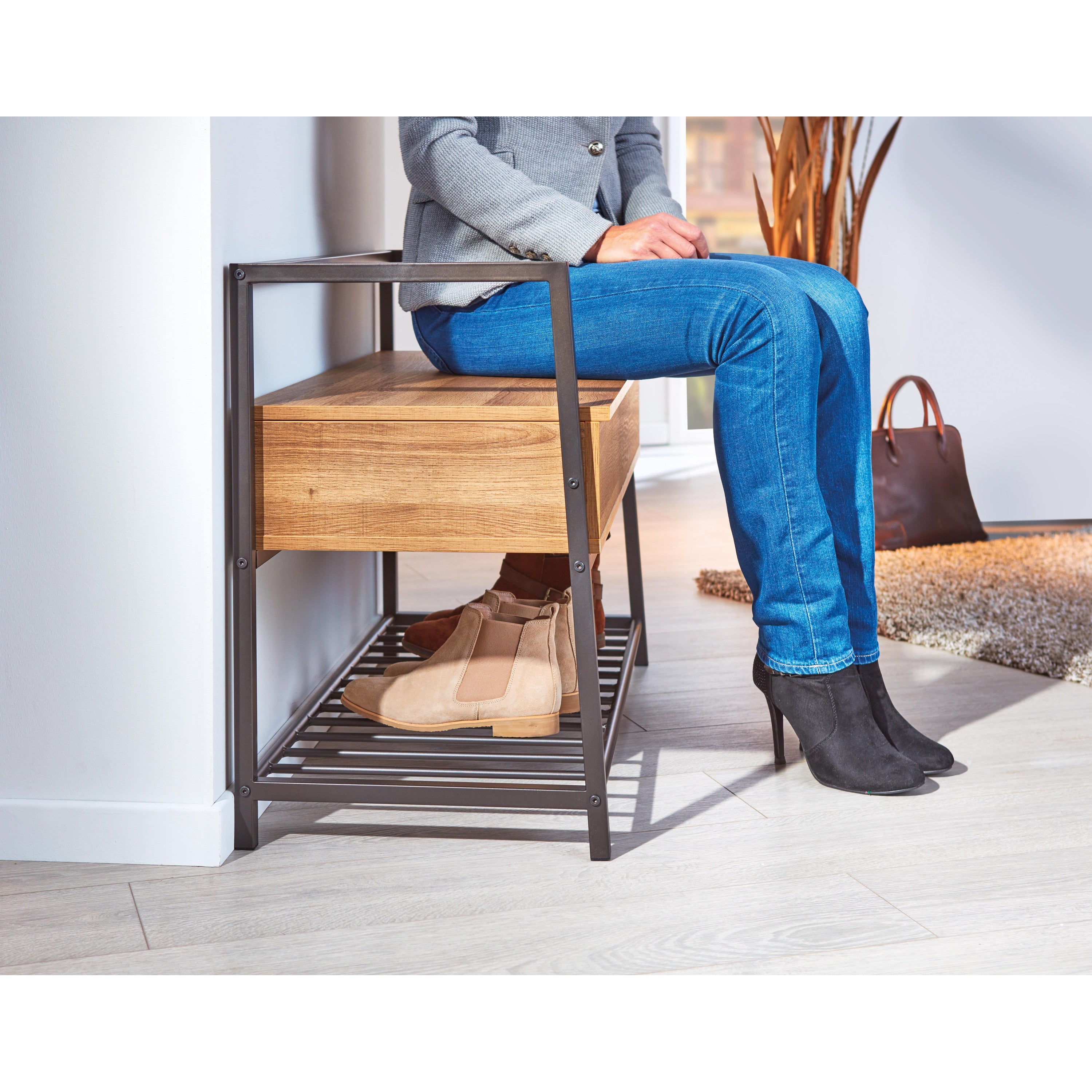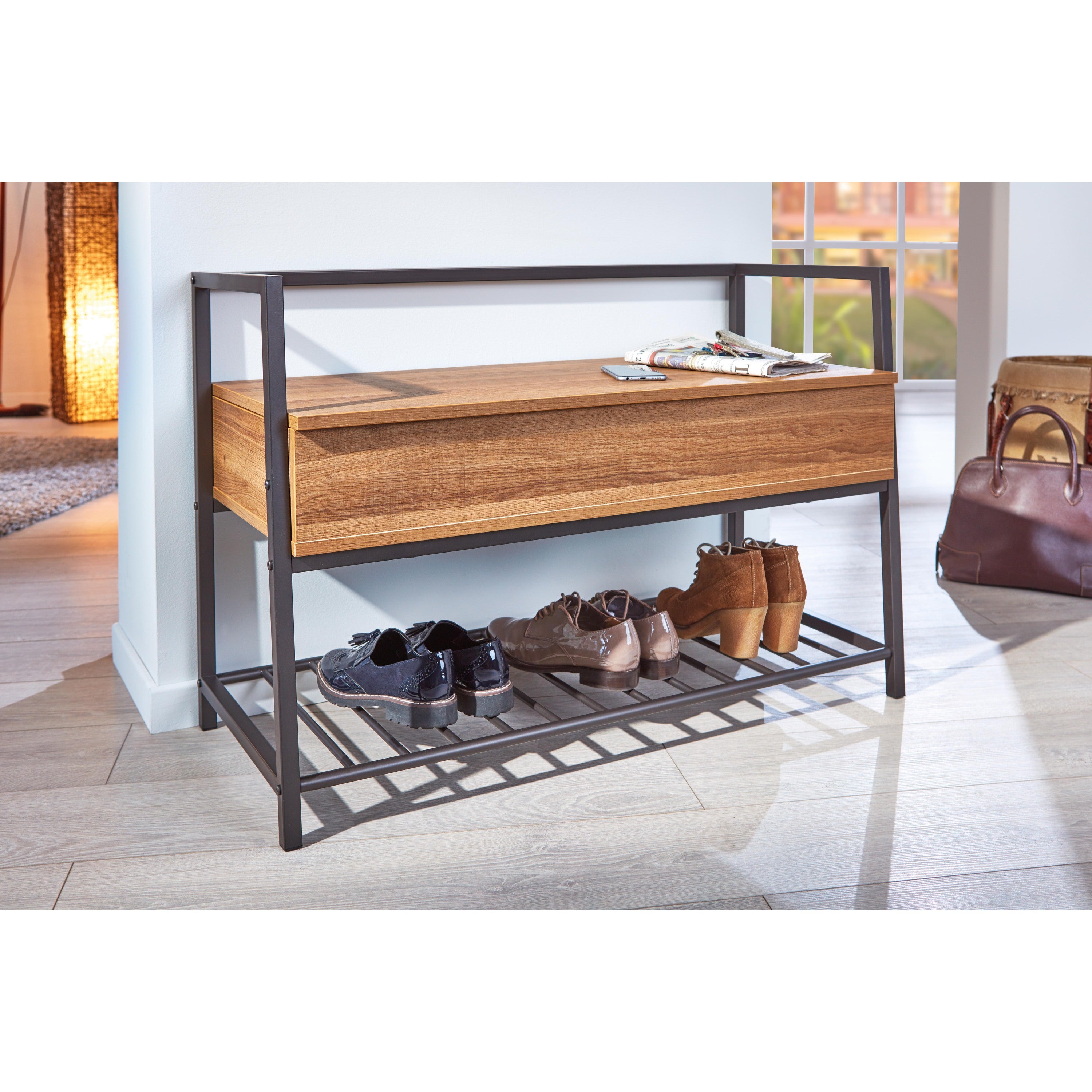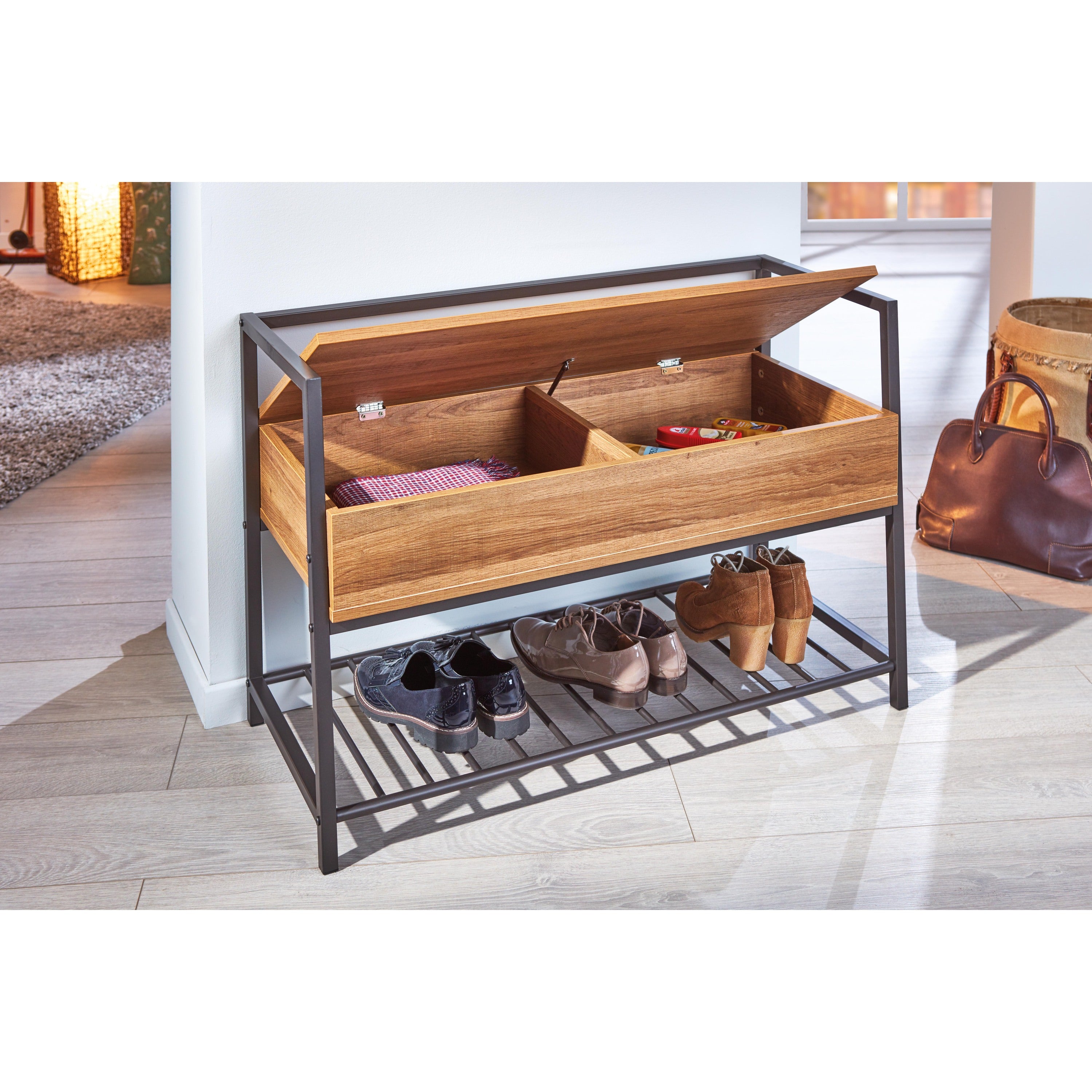 - 1 x Sent schoenenkast met 1 plank en 1 gedeeld vak antraciet en eikenhouten decor.