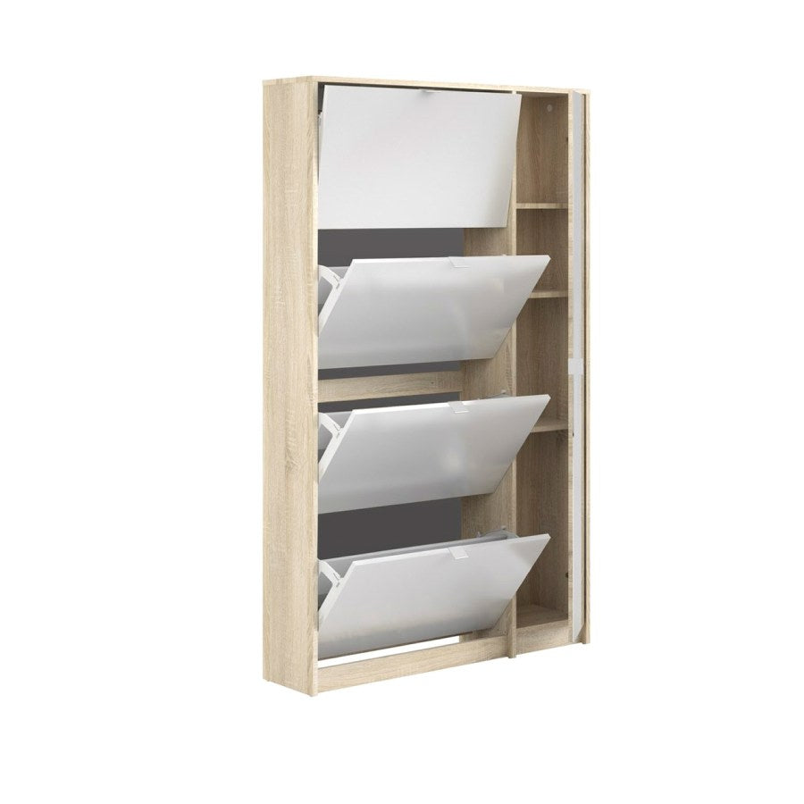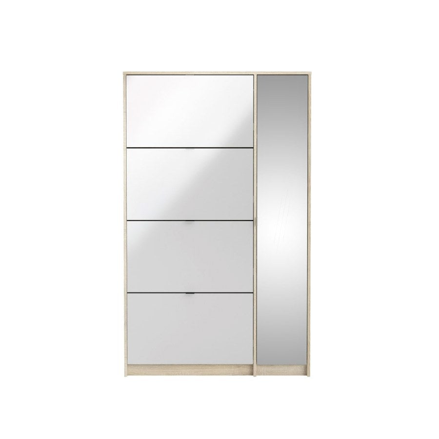 - 1 x Shane schoenenkast 4 klapdeuren 2R, 1 spiegeldeur eikenstructuur decor, wit hoogglans.