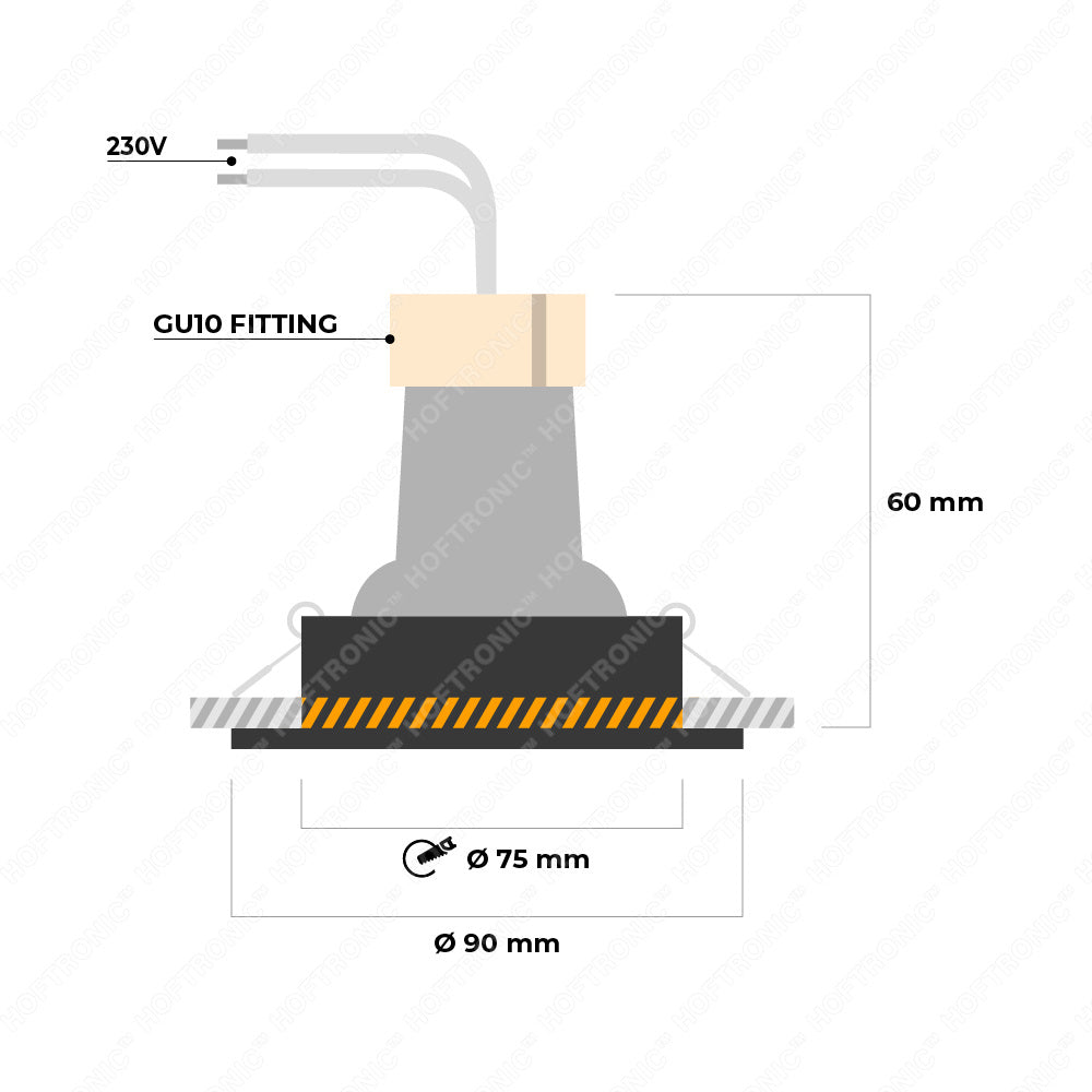 - De inbouwspots hebben een inbouwdiepte van: 60 mm een zaagmaat van: Ø 75 mm en een diameter van: Ø 90 mm
