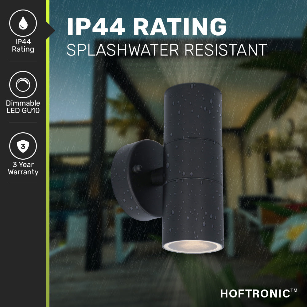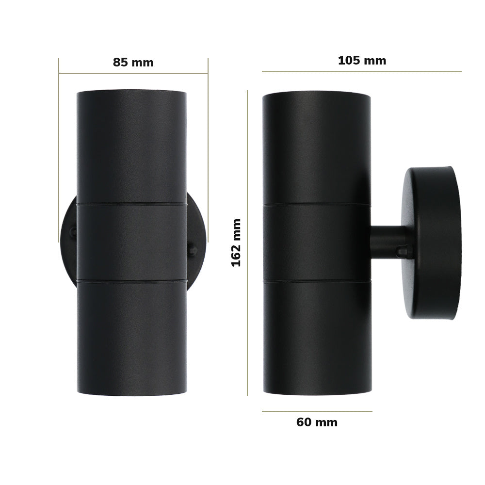Moderne wand buitenlamp uitgevoerd in zwart geschikt voor GU10 spots. Deze mooie wandspot 4000K is Up & Down light, tevens zijn de spots eenvoudig vervangbaar en ontvang je 3 jaar garantie. Uitermate geschikt voor woonkamer, badkamer en buitengebruik!