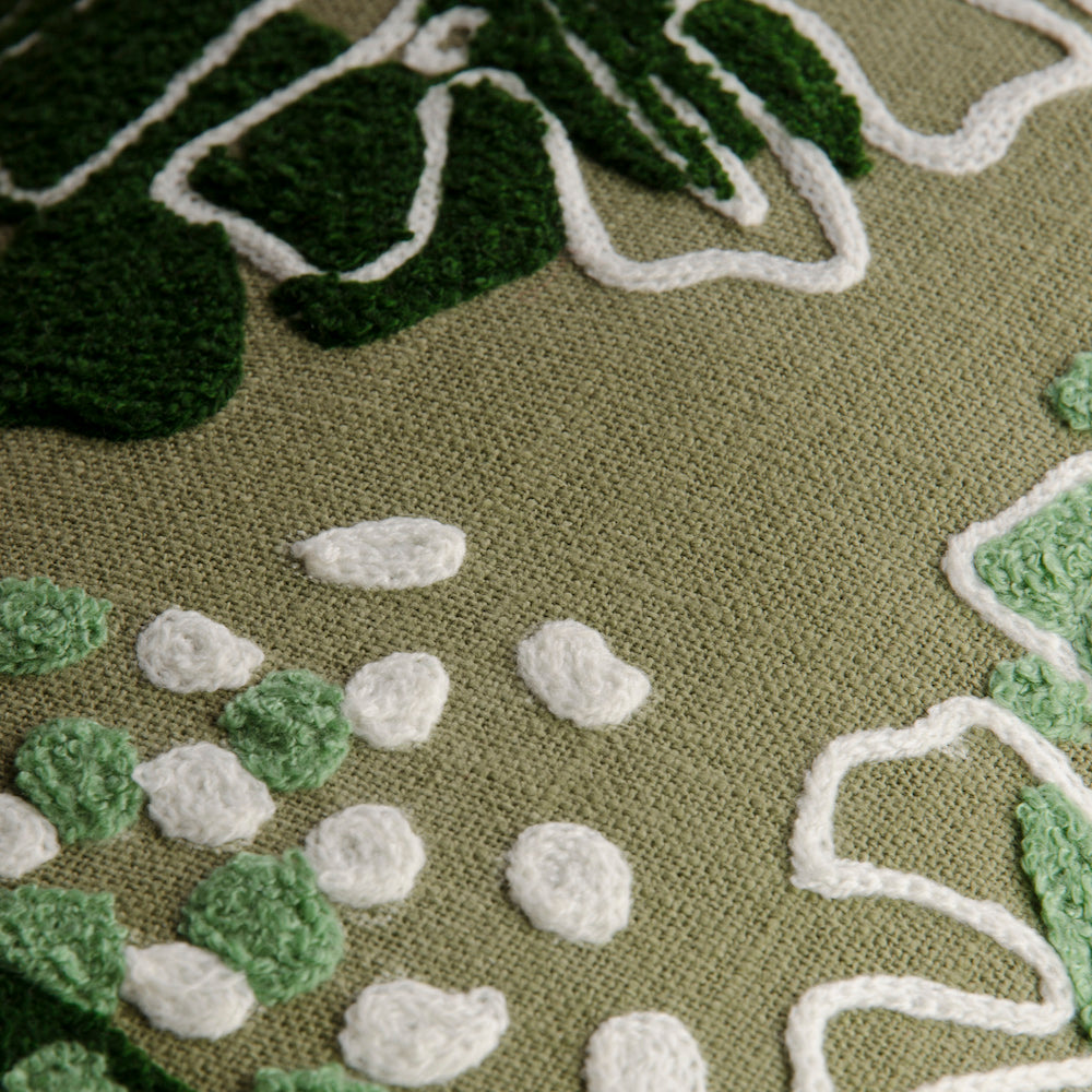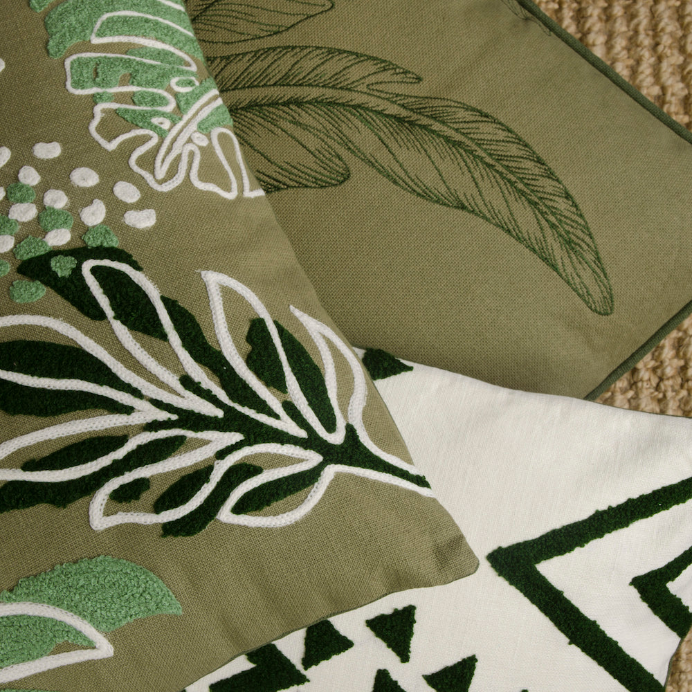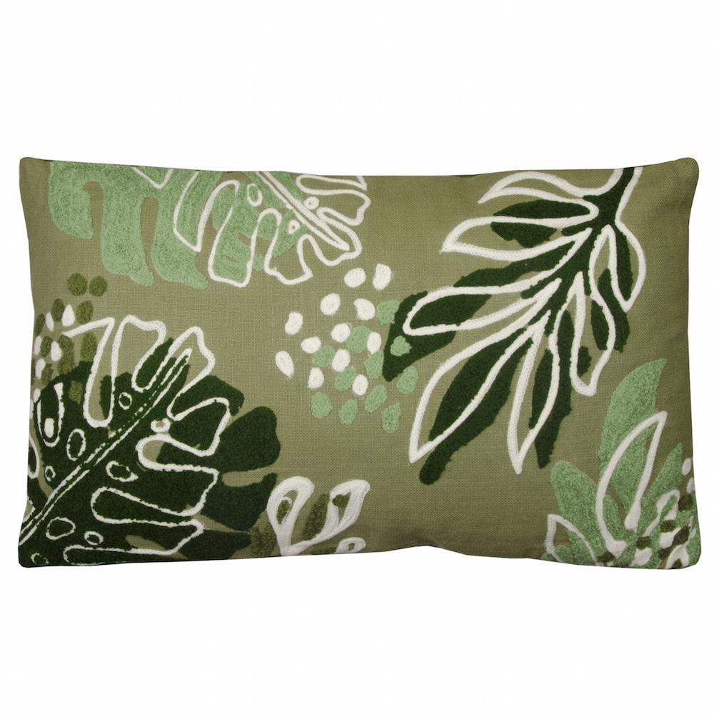 Dit speelse sierkussen botanisch groen heeft verschillende structuren, borduur, teddy en print. De groene kleuren matchen gemakkelijk in ieder interieur.