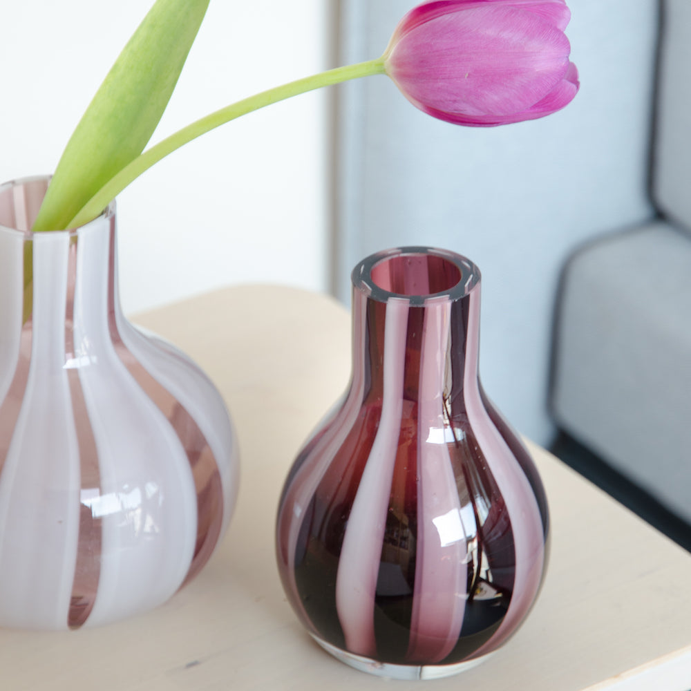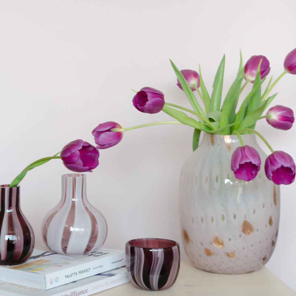 Een vaas gemaakt van glas met een prachtig roze patroon. Zet verschillende vazen bij elkaar voor extra sfeer in huis.