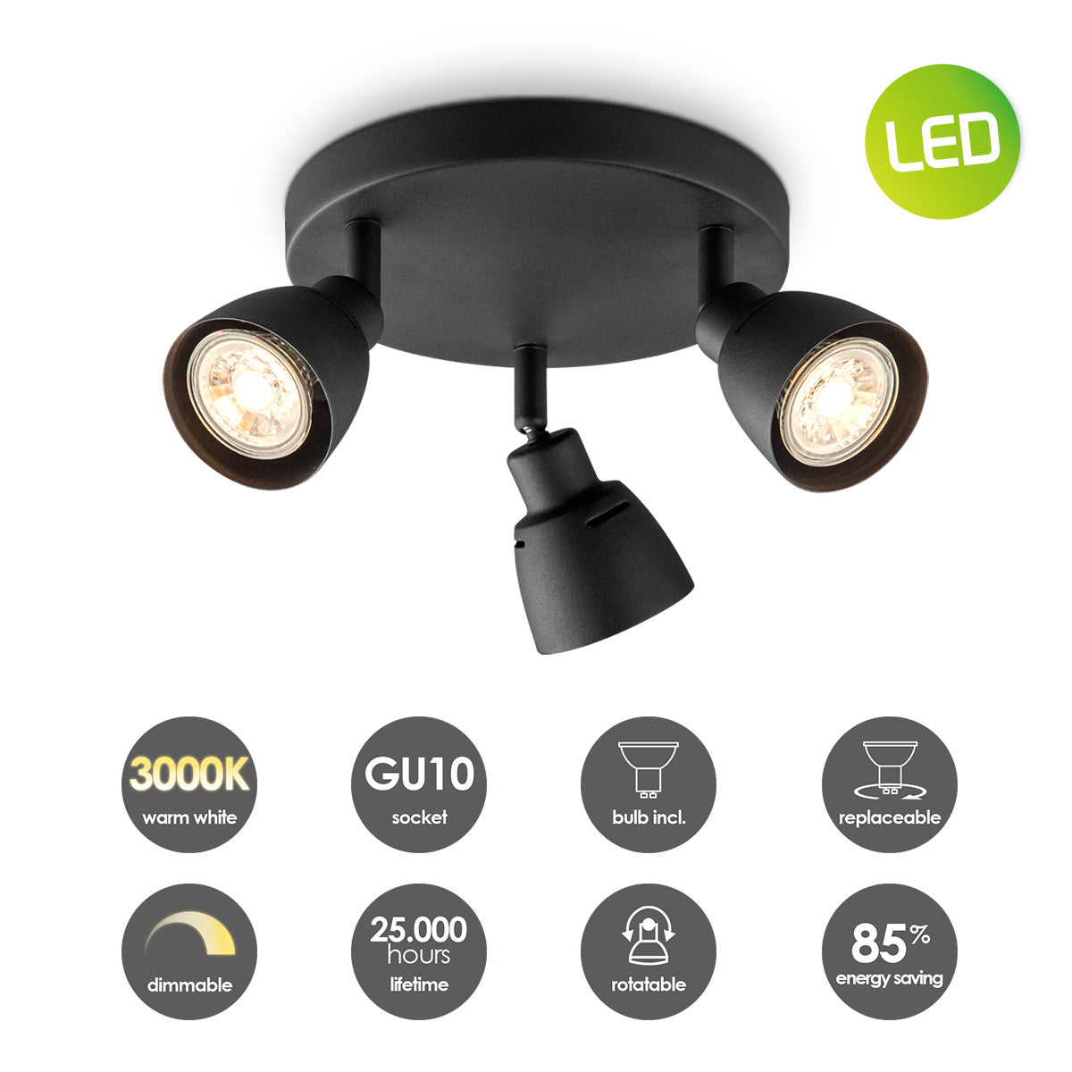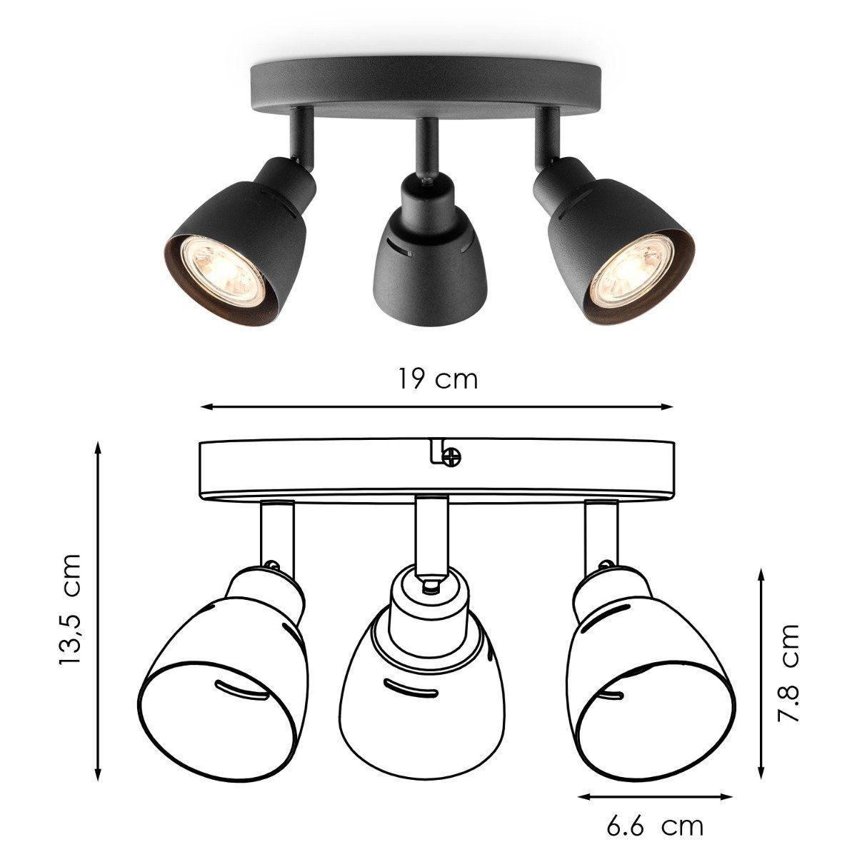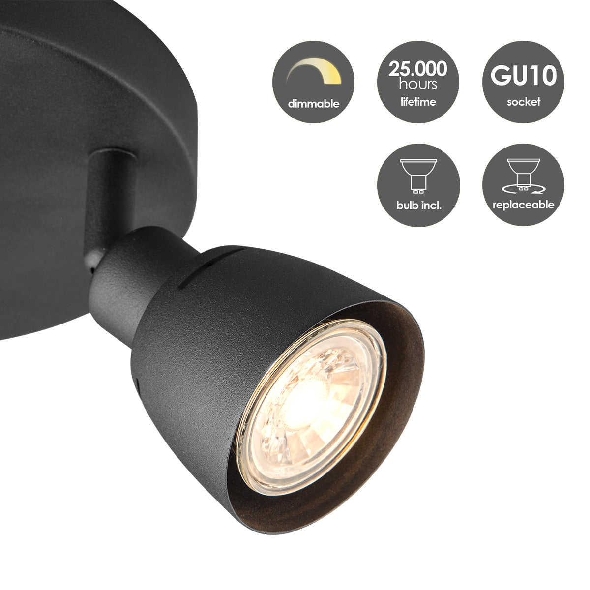 Aka schijnt zijn verstelbare zwarte spotlights op alle belangrijke plaatsen rondom. De opbouwspot (niet-dimbaar) ontvang je inclusief GU10 LED lichtbronnen. Geniet van helder warmwit licht (3000K). Afmetingen: B 19 cm x H 13,5 cm.