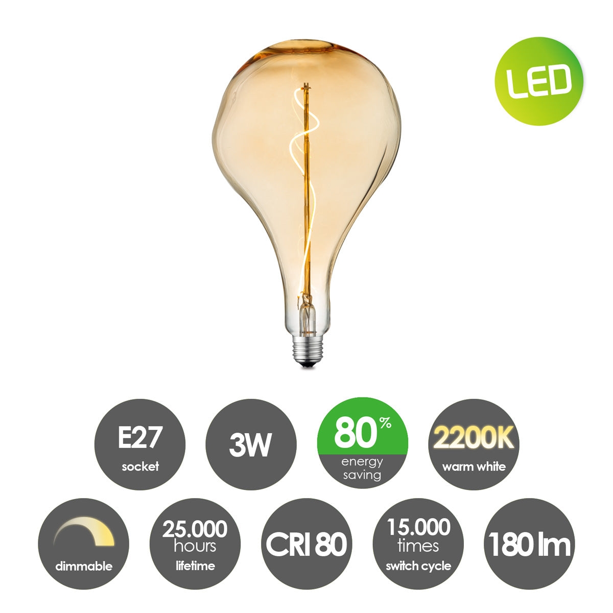 - LED lamp specificaties: LED Flex Blown E27 3W 180Lm 2200K dimbaar en geeft Warm Wit Licht. Kleur glas amber.