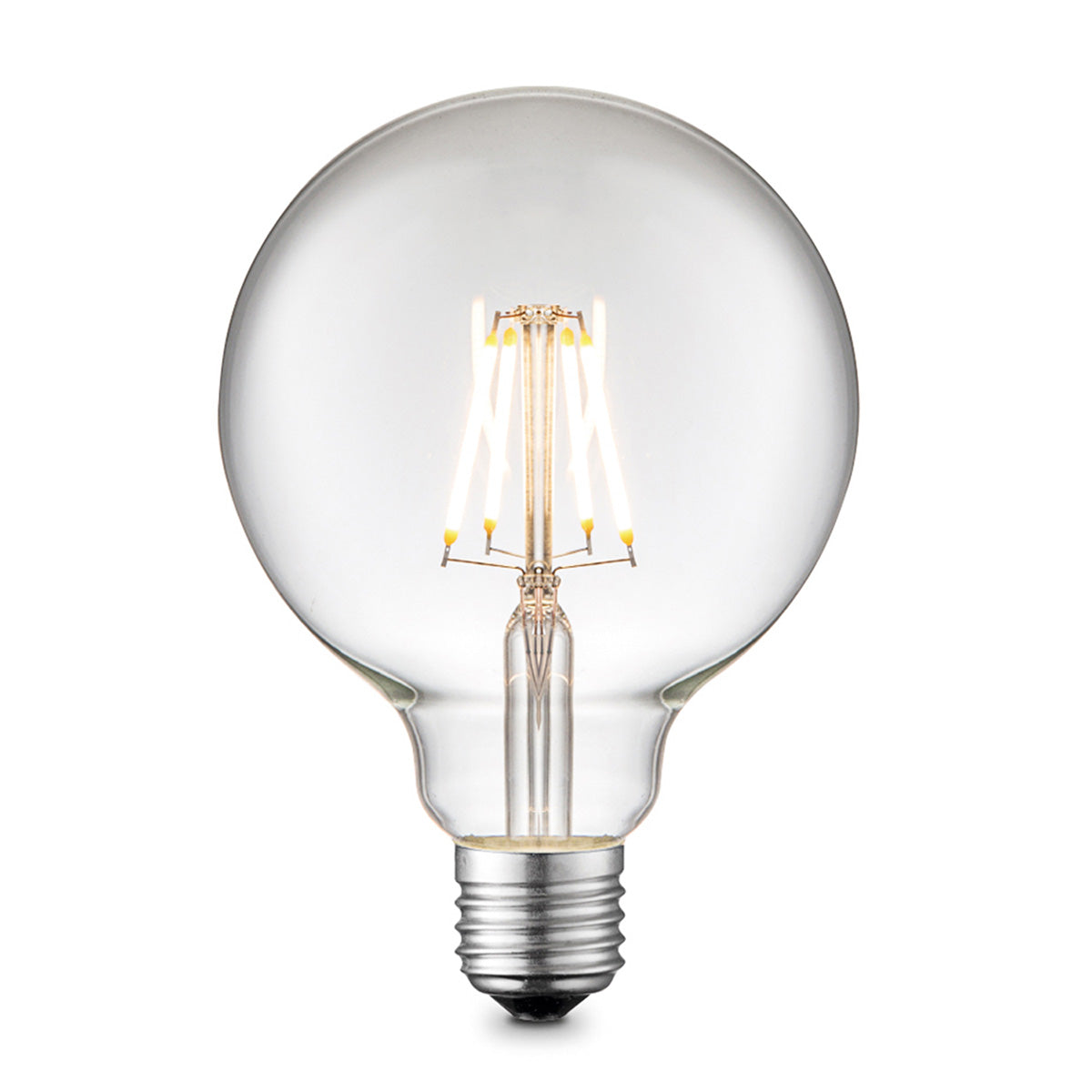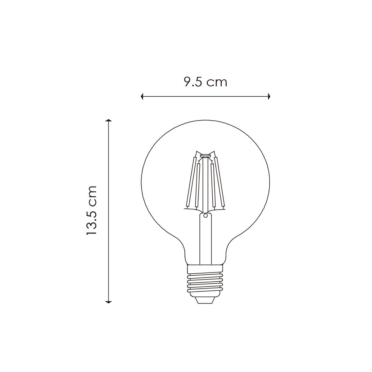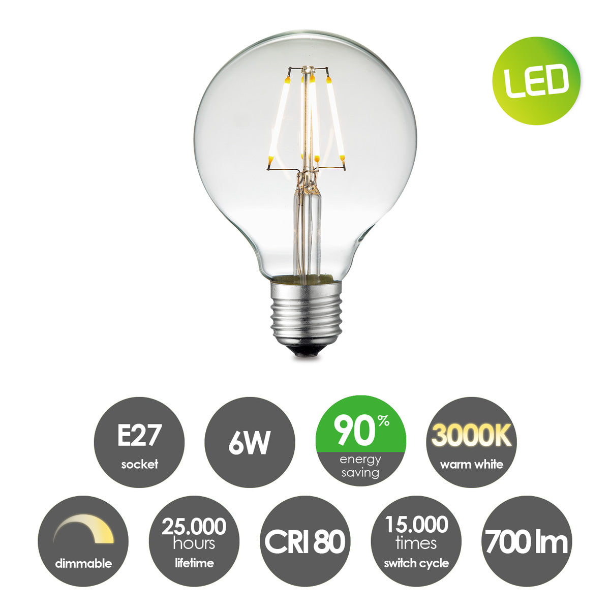 - LED lamp specificaties: Dimbaar Globe E27 G95 6W 700Lm 3000K dimbaar en geeft Warm Wit Licht. Kleur glas helder.