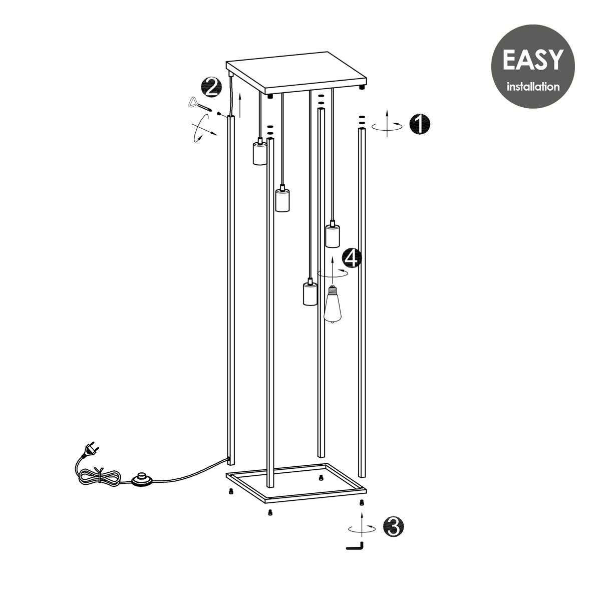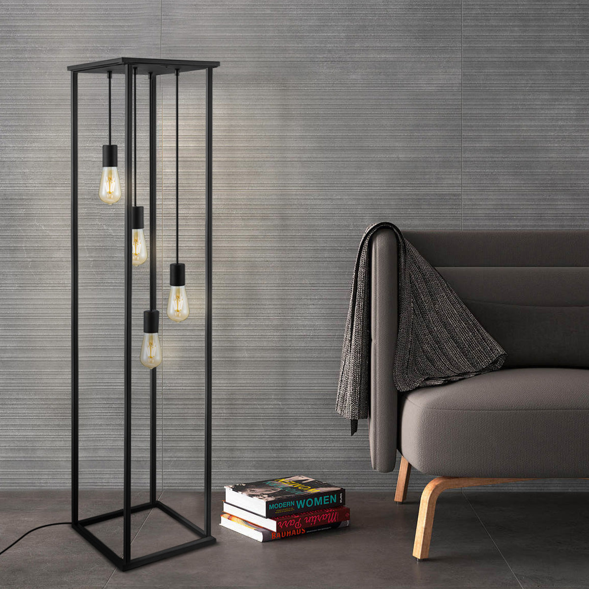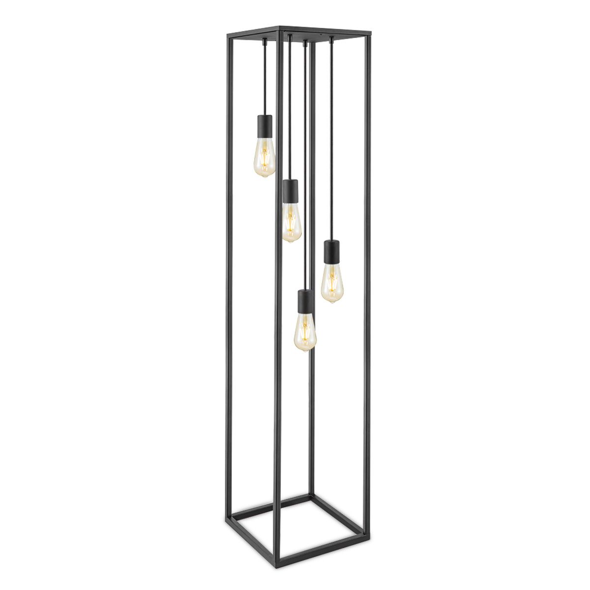 4-Lichts vloerlamp Fall is een trendy open vloerlamp met matzwart frame. Met zijn 140 cm hoogte is hij een echte sfeermaker in jouw woonkamer! Exclusief lichtbronnen. Fall is 35 cm breed en 140 cm hoog, met 200 cm snoer.