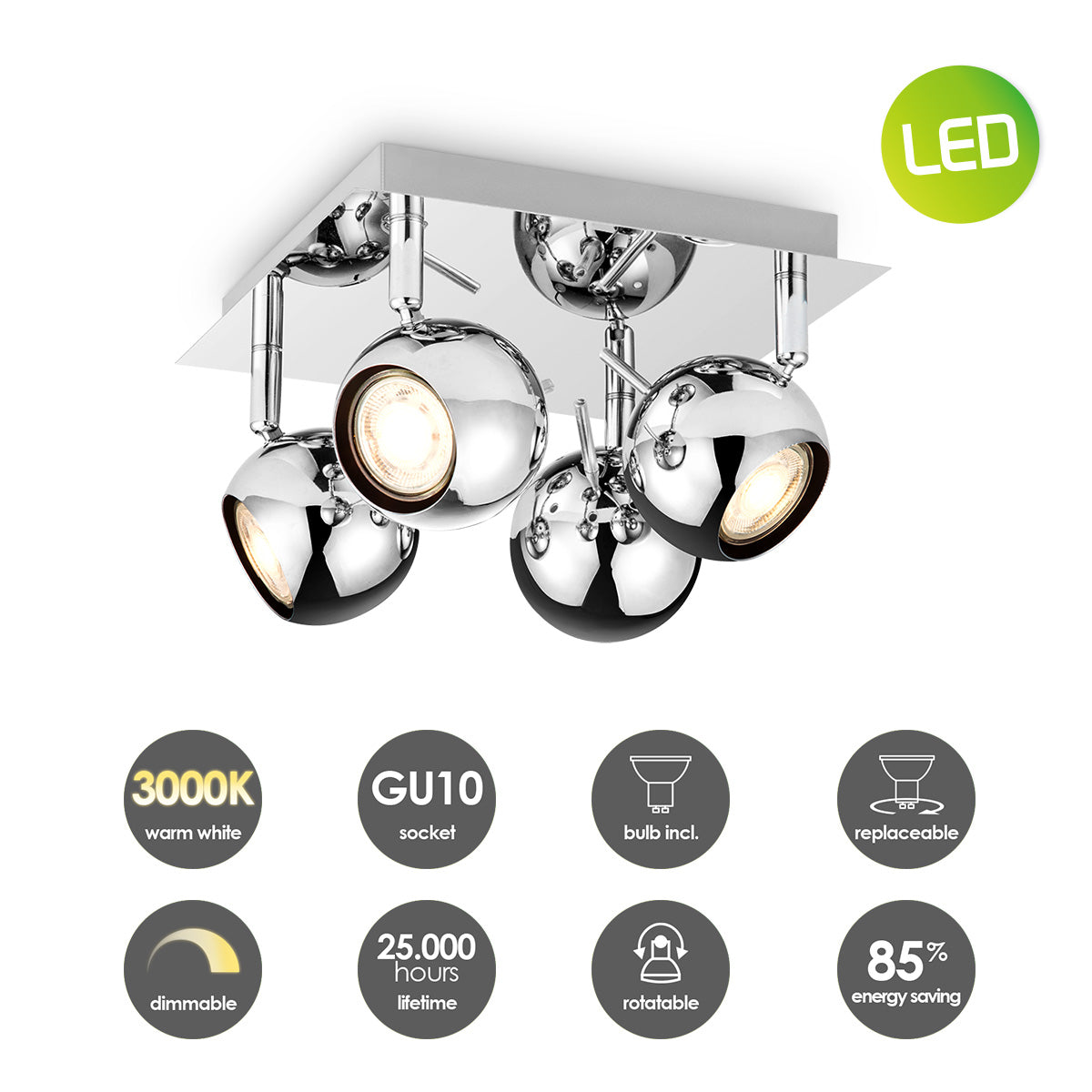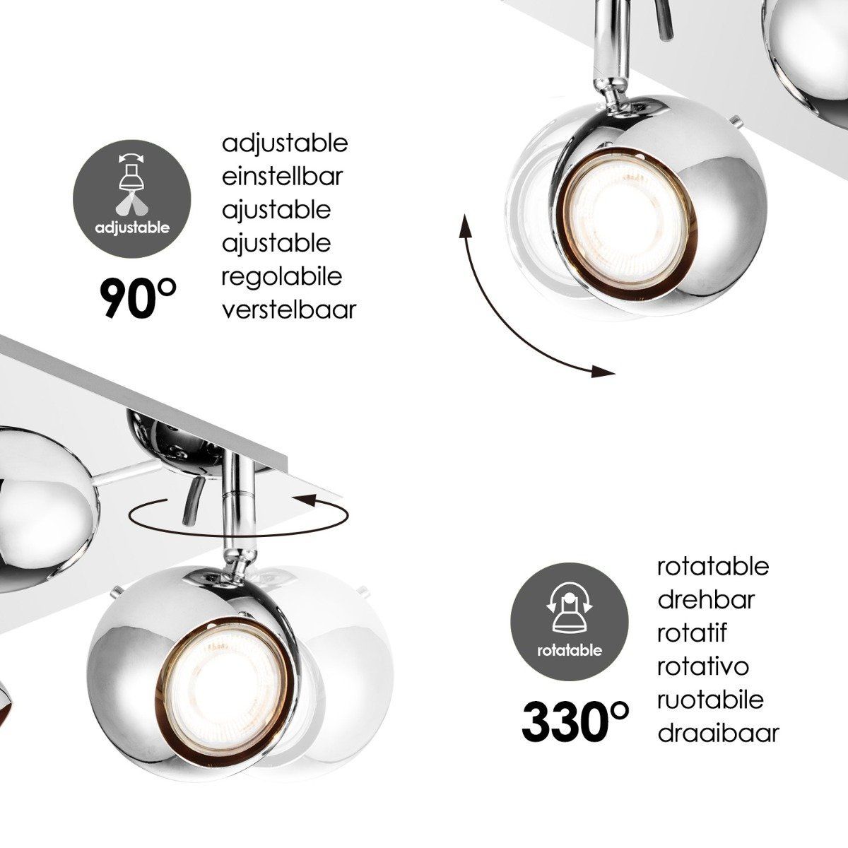 - De spots zijn verstelbaar, kantelbaar en draaibaar. Ideaal voor het verlichten van de woonkamer, slaapkamer, studeerkamer, hobby ruimte en de hal.