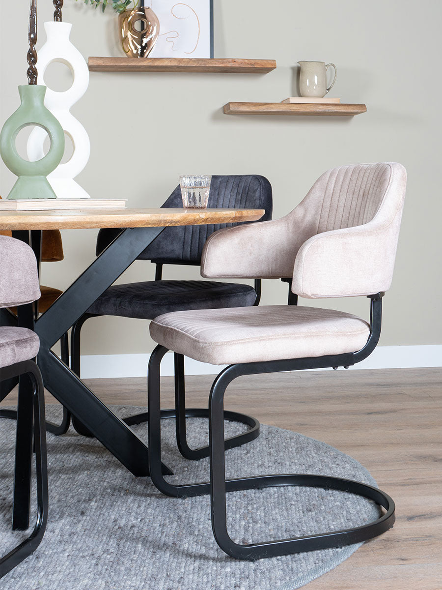 - De brede, rondlopende armleuningen van eetkamerstoel Fox zorgen ervoor dat je heerlijk lang kan tafelen