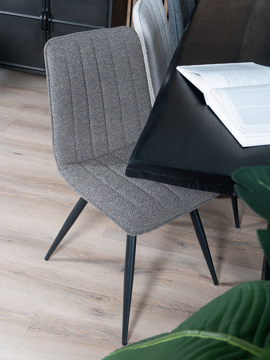 - Eetkamerstoel Joppe is bekleed met een zachte boucle stof, wat zorgt voor een luxueuze en comfortabele zitervaring