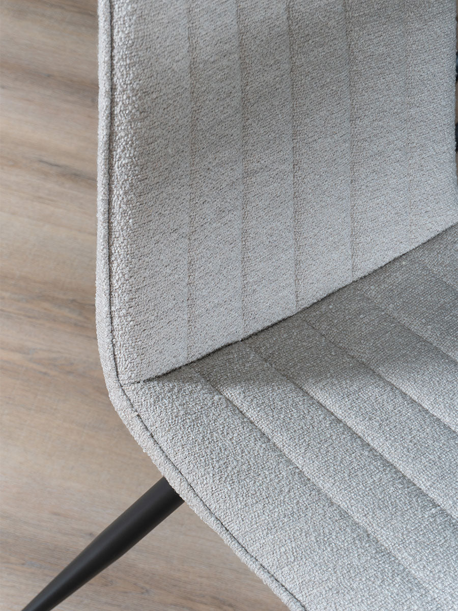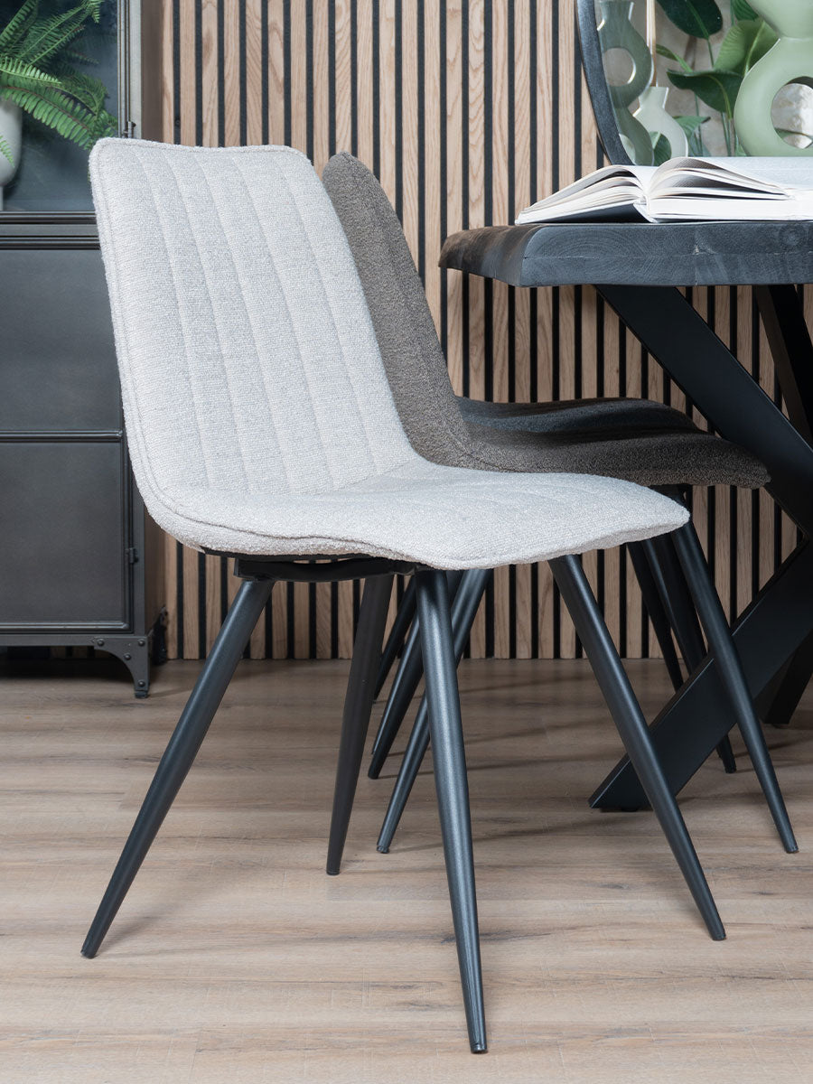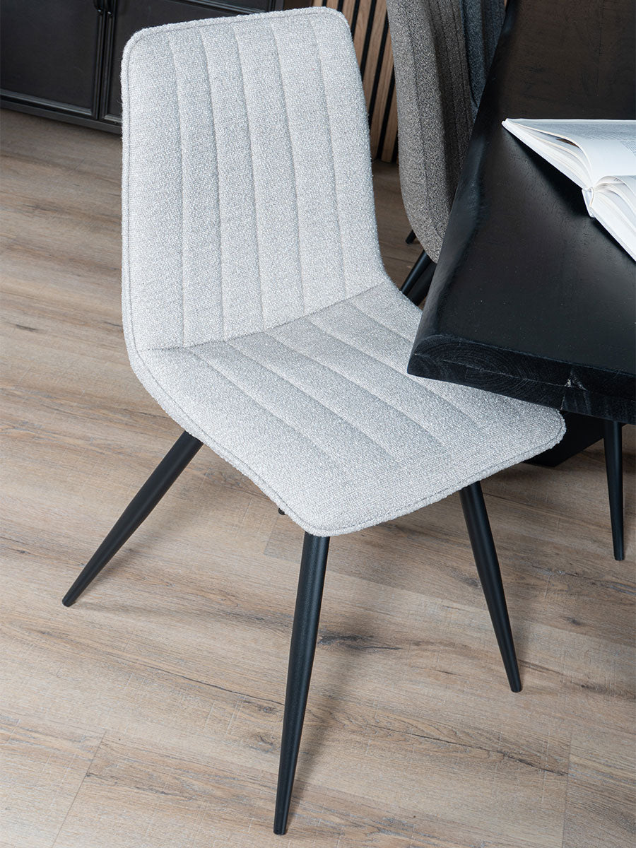 - Eetkamerstoel Joppe is bekleed met een zachte boucle stof, wat zorgt voor een luxueuze en comfortabele zitervaring