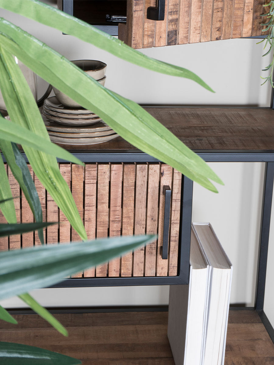 - Hij biedt het beste van twee werelden met zijn open vakken en mooie houten deurtje