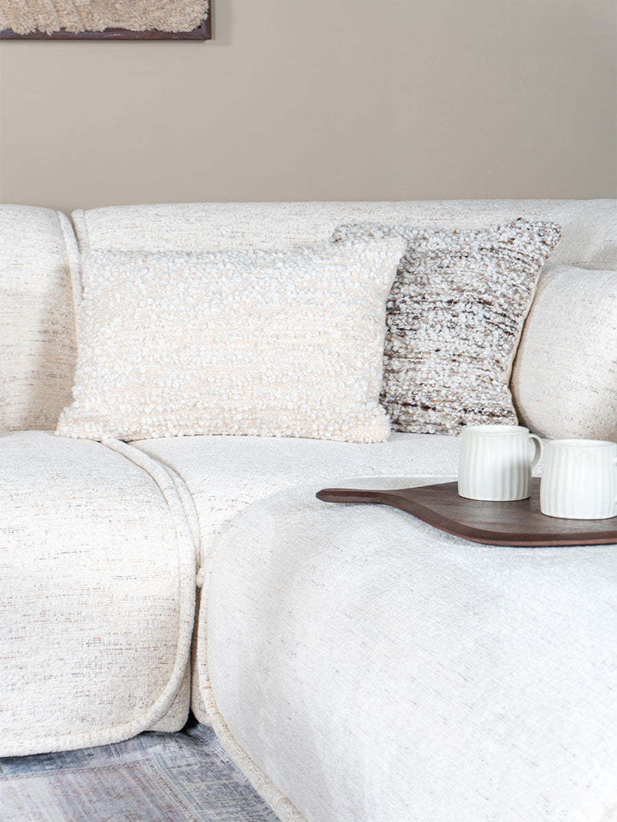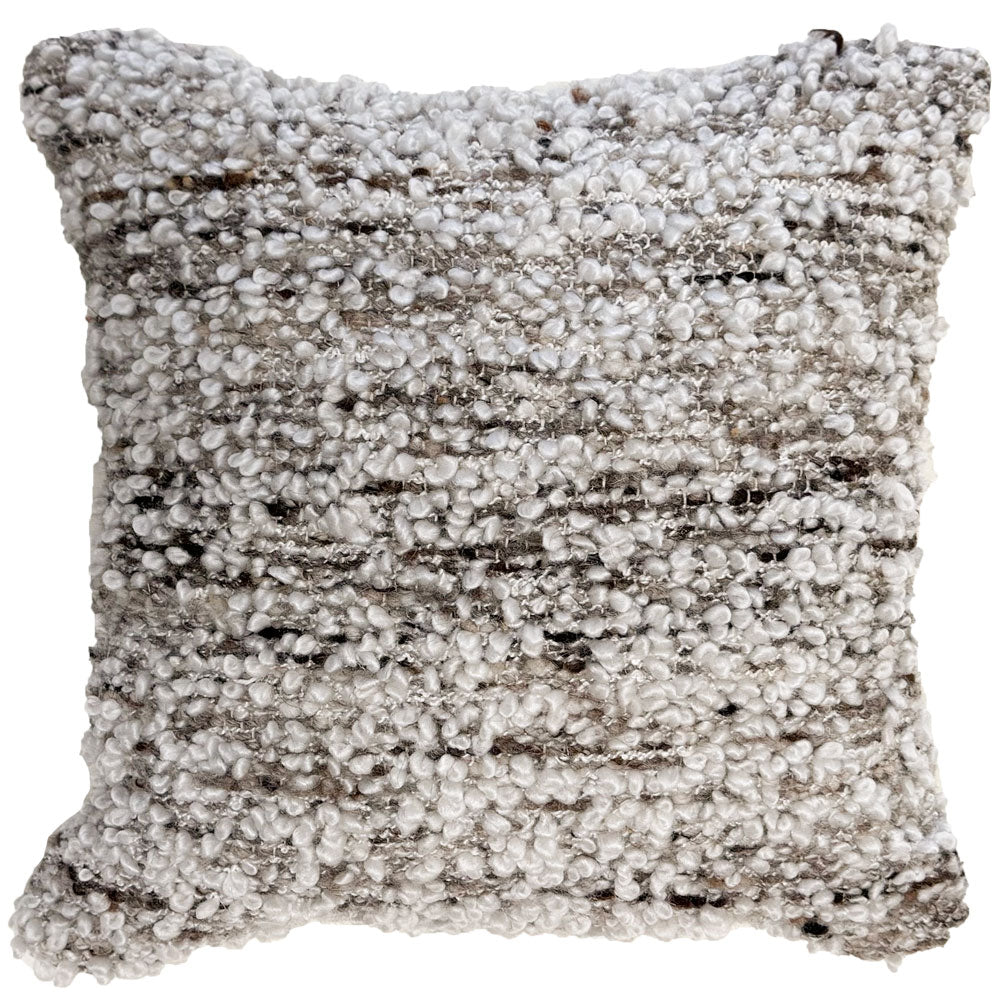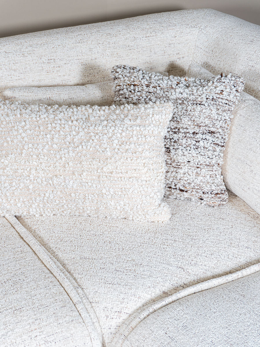 - De structuur van dit kussen bestaat uit fijne lusjes en een geweven design, met verschillende beige en bruine tinten, wat zorgt voor een subtiele