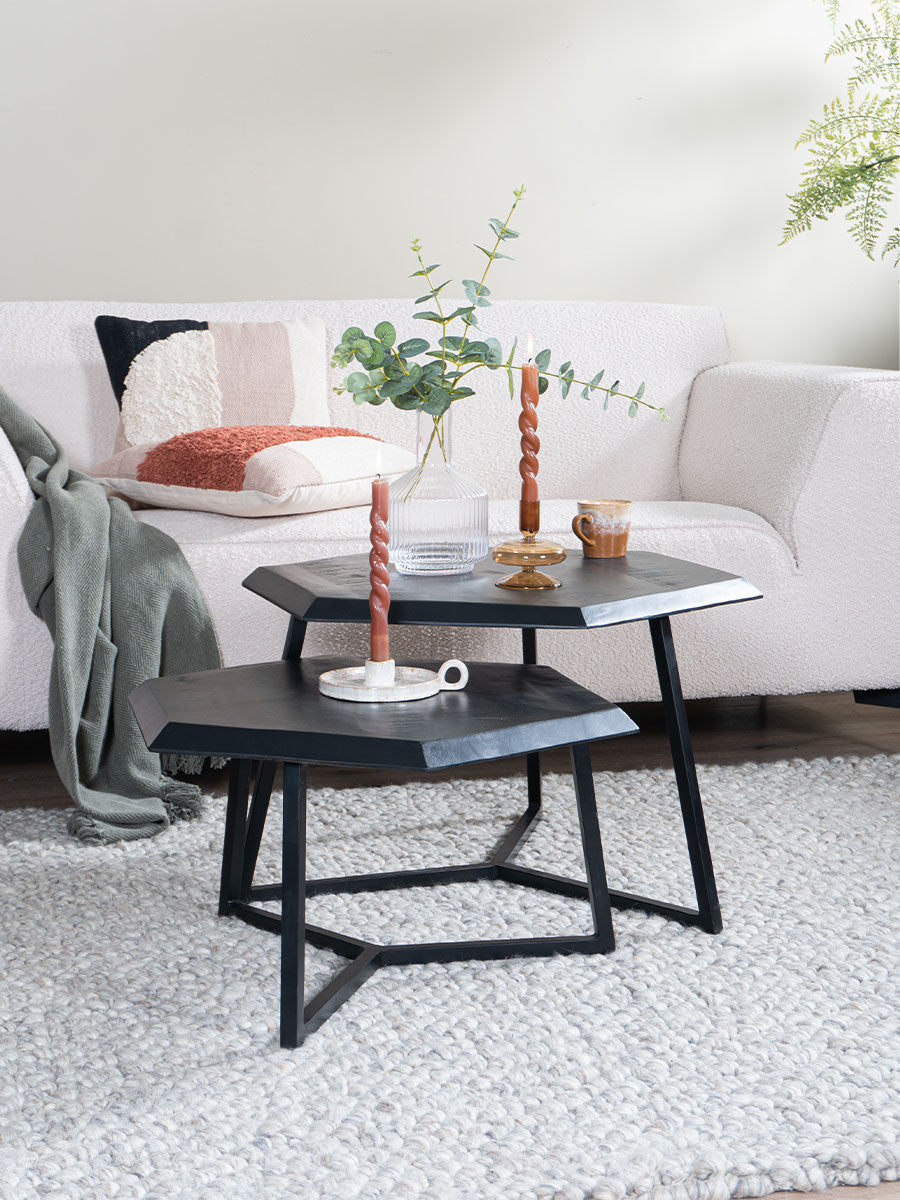 Salontafel Kiara is een set van 2 tafels. De combinatie van een slanke metalen frame en zeshoekige mangohouten blad, geeft deze salontafel set van 2 een speelse en stoere look. De twee tafels, van de bijzettafel set van 2 zwart, verschillen in