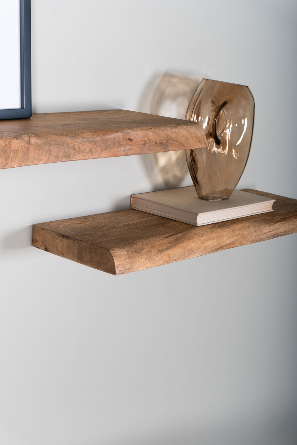 - De wandplank is gemaakt van massief mangohout, en de rand van de plank volgt de natuurlijke vorm van de boom, wat deze wanddecoratie een natuurlijke