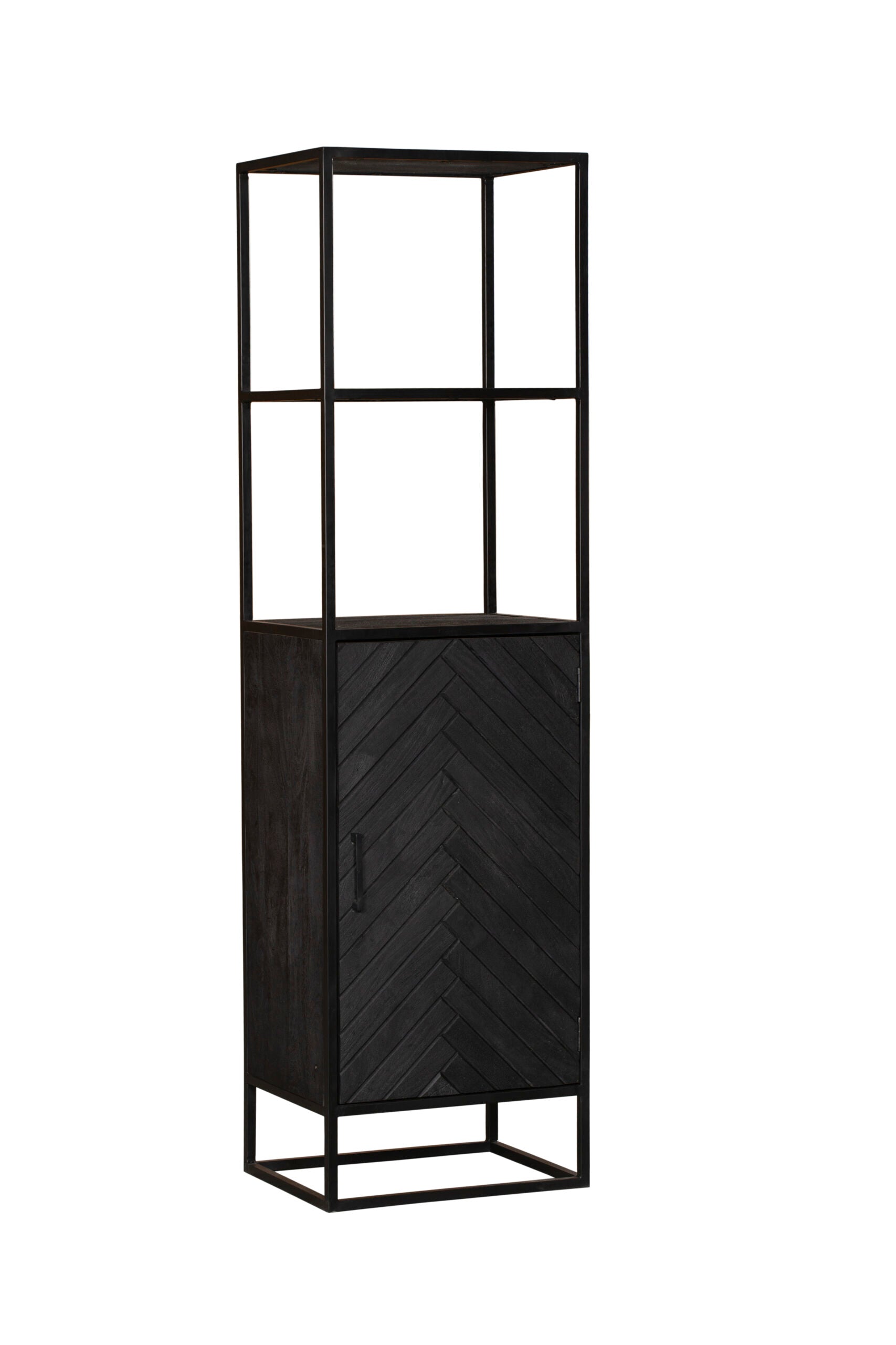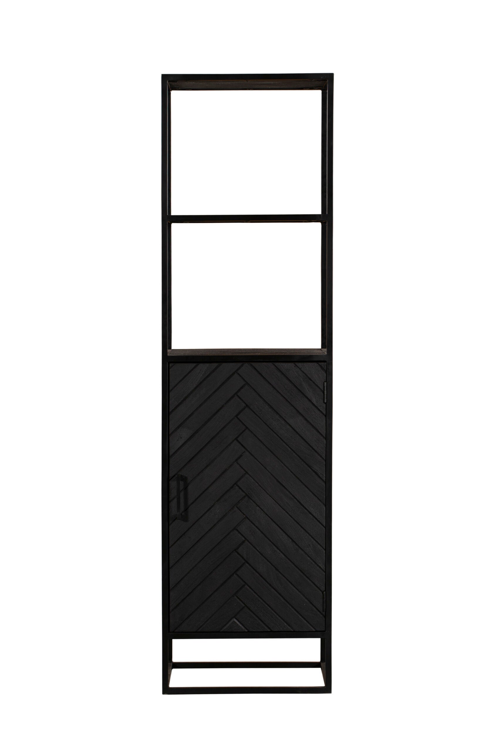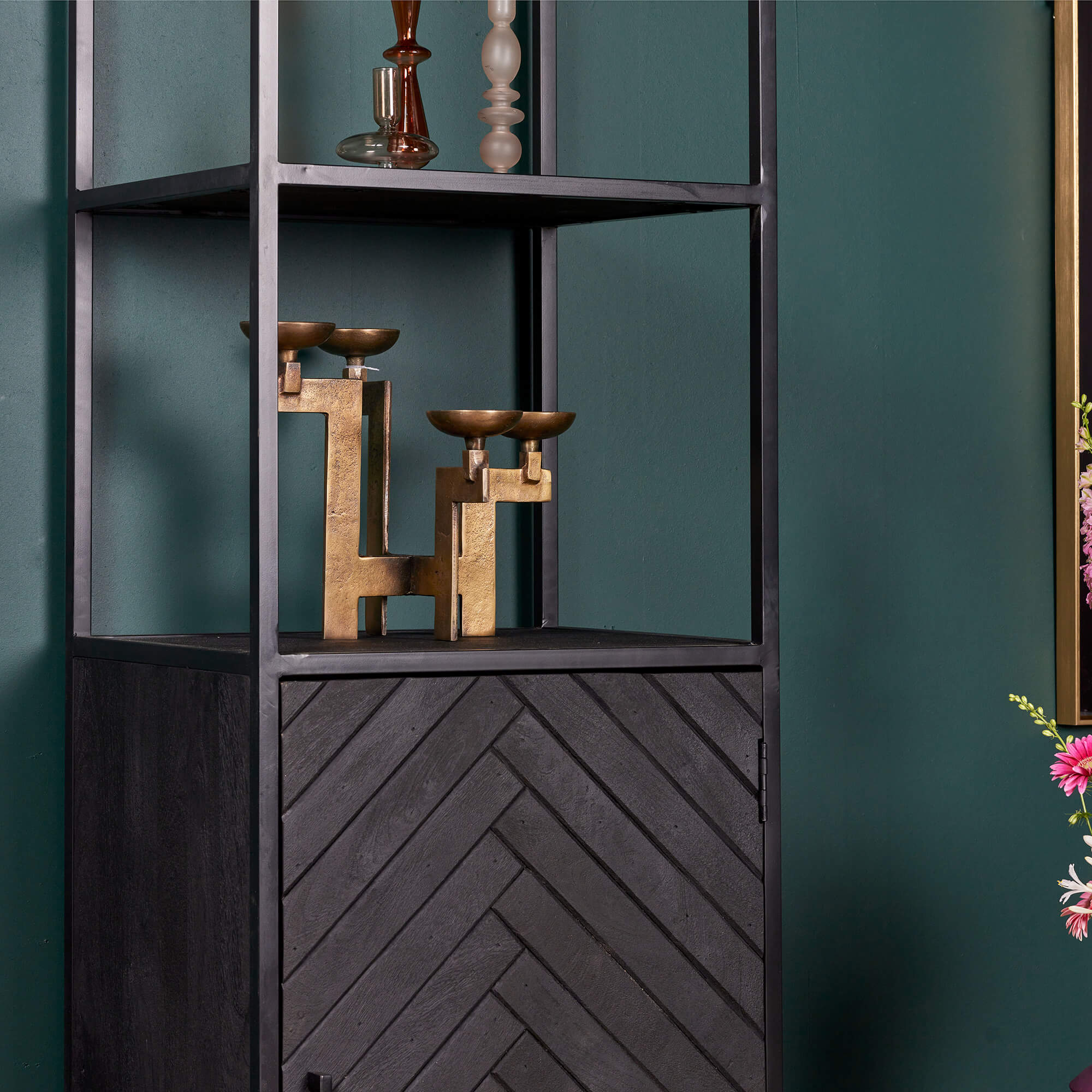Deze boekenkast 'Daan' heeft 1 deur en een legplank. Het mangohout in de deur is ingelegd in een visgraatpatroon. Het frame en de handgreep zijn gemaakt van metaal en afgewerkt met een zwarte lak. De kast is uitgevoerd in gezandstraald massief mangohout en is behandeld met een zwarte lak. Deze boekenkast is onderdeel van de 'Daan' serie.