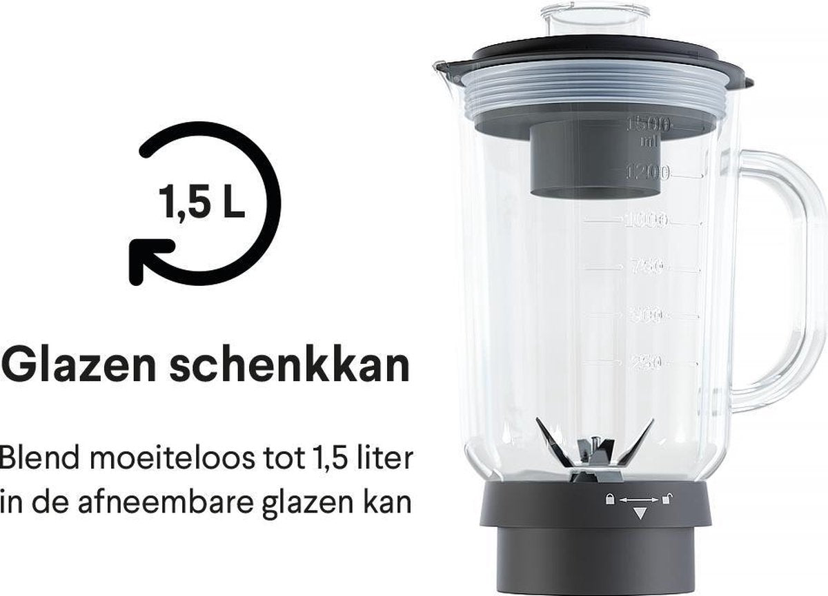 - GLAZEN SCHENKKAN - Blend moeiteloos tot 1,5 liter in de afneembare glazen kan. Was hem na gebruik gemakkelijk in de vaatwasser!
