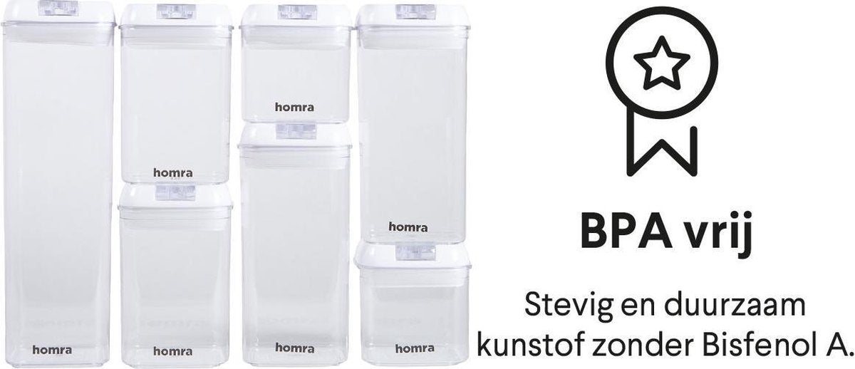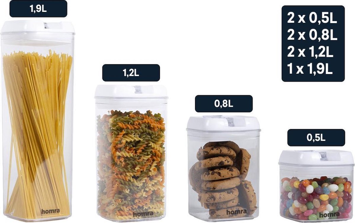 - VERSCHILLENDE FORMATEN – Een set van 7 Homra Freshboxen bevat 4 verschillende formaten voorraadpotten. 2 x 0.5L – 2 x 0.8L – 2 x 1.2L - 1 x 1.9L.