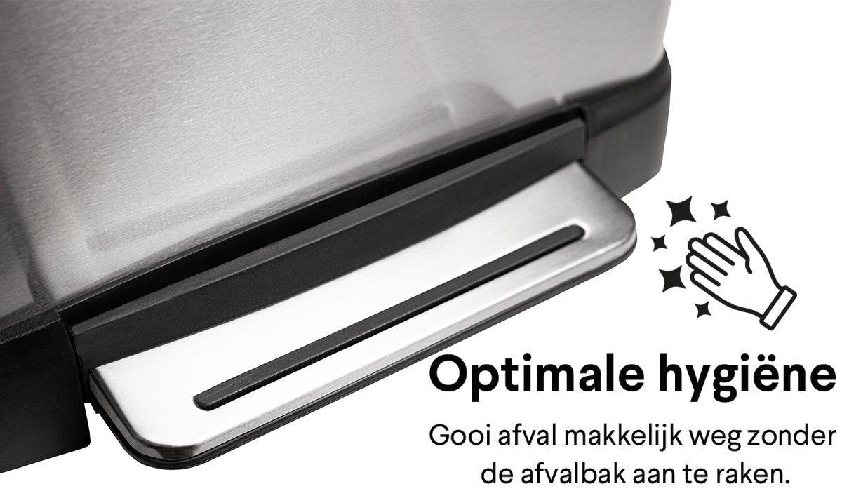 - OPTIMALE HYGIËNE - Hij opent door middel van een voetpedaal. Om de deksel te openen plaats je een voet op het pedaal en druk je het pedaal zachtjes naar beneden. Laat het pedaal weer los om de deksel te sluiten.