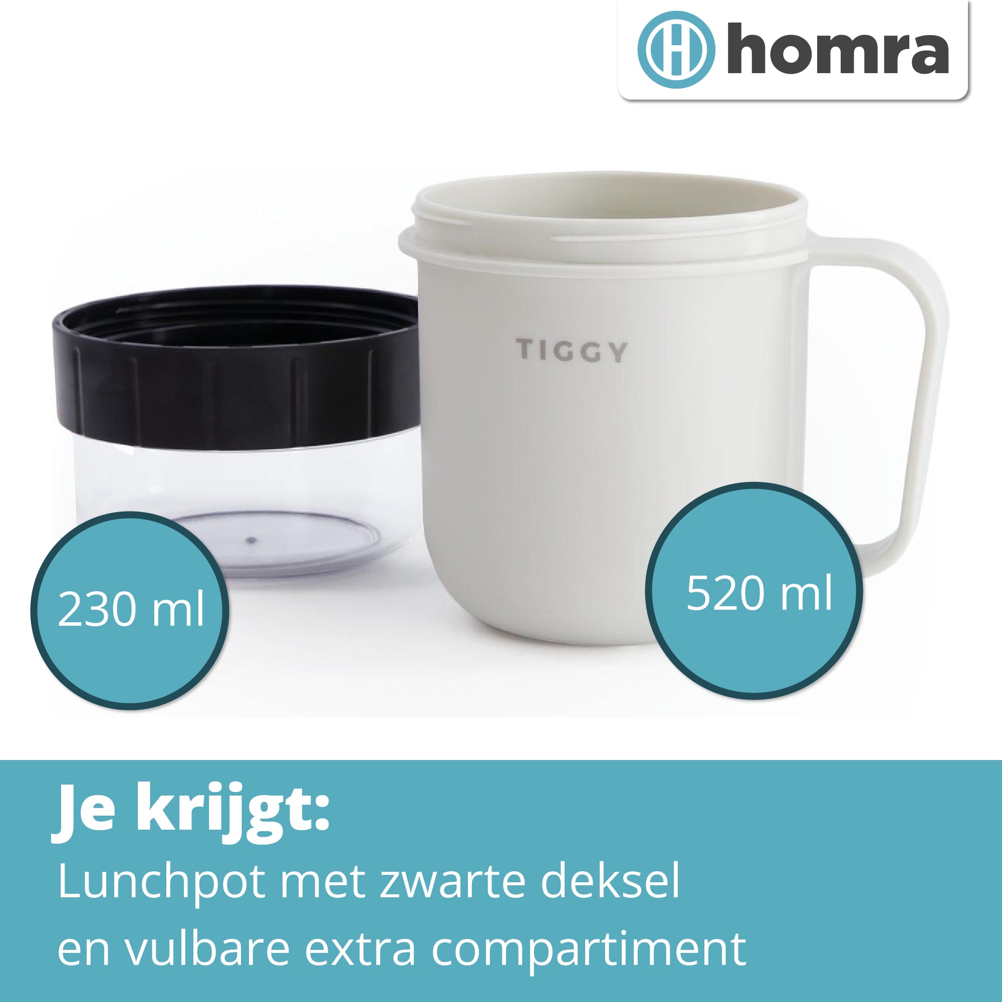 De TIGGY Grey van Homra is dé perfecte lunchpot voor jouw tussendoortje of lunch. Het item is compact en heeft twee compartimenten. Hierdoor scheid je gemakkelijk jouw eten van elkaar. Perfect voor het meenemen van yoghurt, soep, noedels, groente of fruit. De lunchpot heeft aan beide kanten van de deksel een siliconen rand, waardoor hij lucht- en waterdicht is. Hierdoor blijft jouw tussendoortje lekker vers zonder geknoei! In vergelijking met vele andere lunchpotten heeft de TIGGY een handvat. Hierdoor is het item gemakkelijk vast te houden, vooral bij hete dranken. Enjoy your lunch! Voordelen van deze TIGGY Grey lunchpot