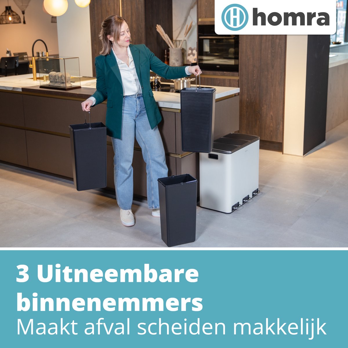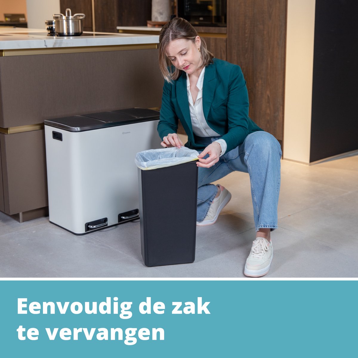 In de compartimenten zitten binnenemmers. Aan elke binnenemmer zit een handvat waardoor je de binnenemmer makkelijk uit de bak tilt. Hierdoor is het erg makkelijk om de prullenbak te legen. Vingerafdrukvrij en vuilafstotend