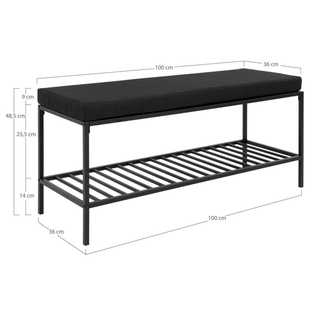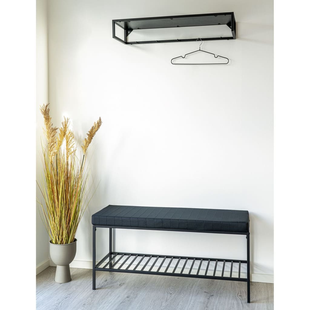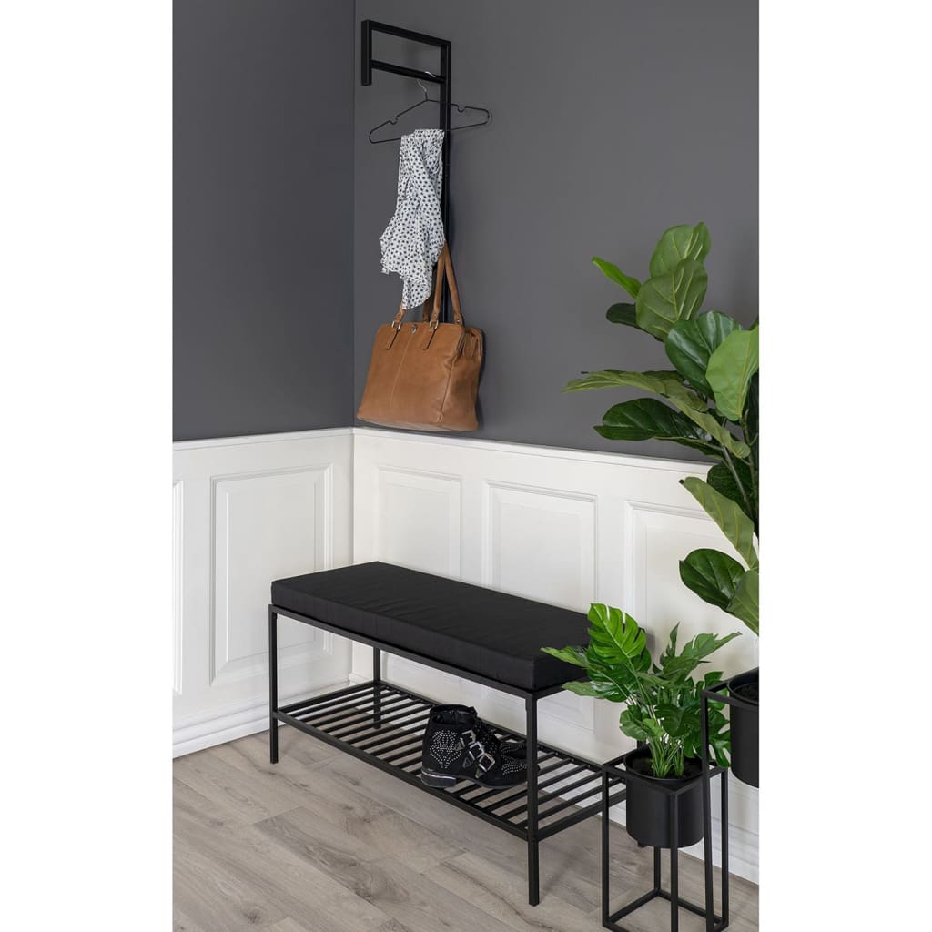 Heb je nog een extra zitplek met opbergruimte nodig? Dit trendy Avery bankje van House Nordic is perfect voor in je gang voor al je behoeften. Het frame is gemaakt van zwart staal en het schap van met zwart melamine gecoat spaanplaat. Gebruik het onderste schap om je schoenen of andere items in op te bergen. Er is een kussen inbegrepen voor extra zitcomfort. Met zijn Deense ontwerp en Scandinavische stijl, is dit halbankje een perfecte aanvulling op je gang. Je kunt de items van de Nordic House serie combineren, aangezien ze heel goed bij de trends van tegenwoordig passen.