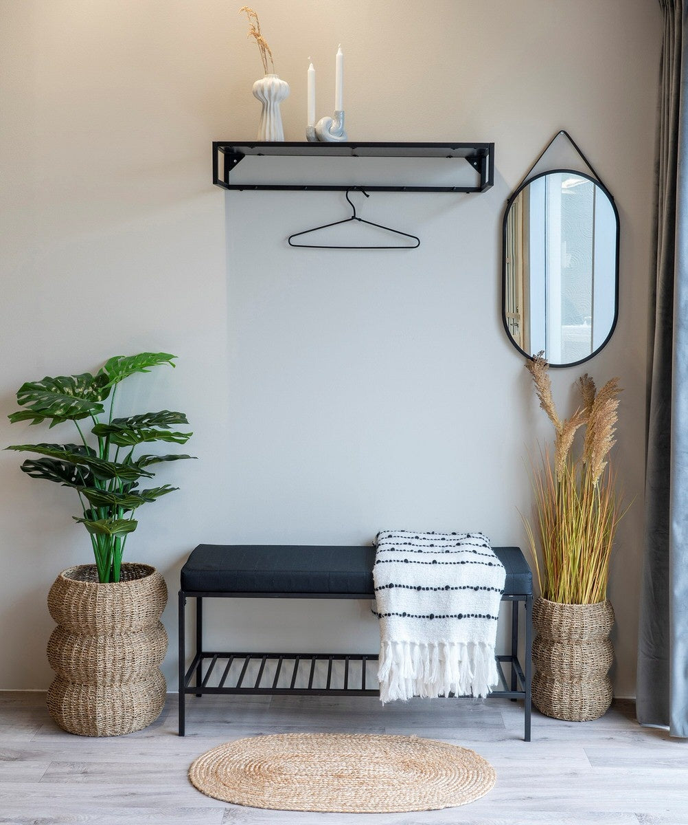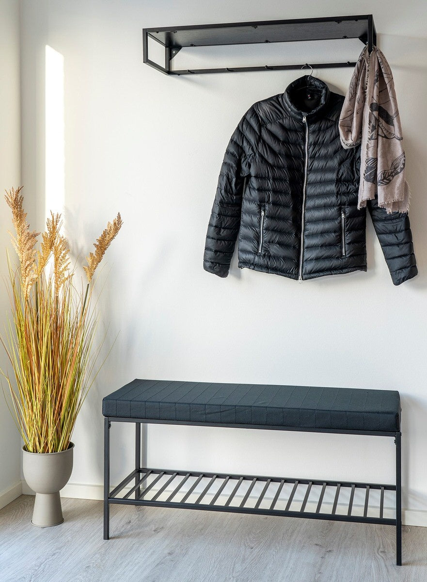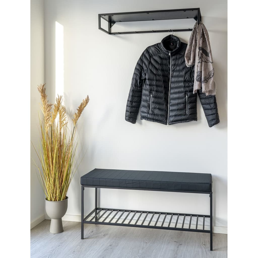 Heb je nog een extra zitplek met opbergruimte nodig? Dit trendy Avery bankje van House Nordic is perfect voor in je gang voor al je behoeften. Het frame is gemaakt van zwart staal en het schap van met zwart melamine gecoat spaanplaat. Gebruik het onderste schap om je schoenen of andere items in op te bergen. Er is een kussen inbegrepen voor extra zitcomfort. Met zijn Deense ontwerp en Scandinavische stijl, is dit halbankje een perfecte aanvulling op je gang. Je kunt de items van de Nordic House serie combineren, aangezien ze heel goed bij de trends van tegenwoordig passen.