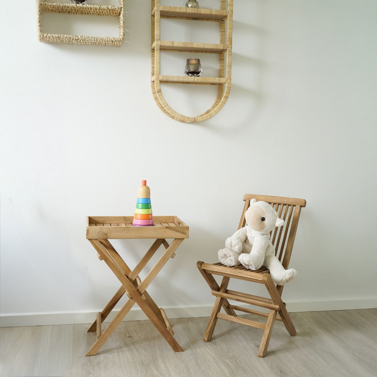 Materiaal: De kinderstoel is volledig vervaardigd uit teakhout, een materiaal dat bekend staat om zijn duurzaamheid en weerbestendigheid. Teakhout is een uitstekende keuze voor meubels die lang mee moeten gaan, en het geeft de stoel een warme, natuurlijke uitstraling.