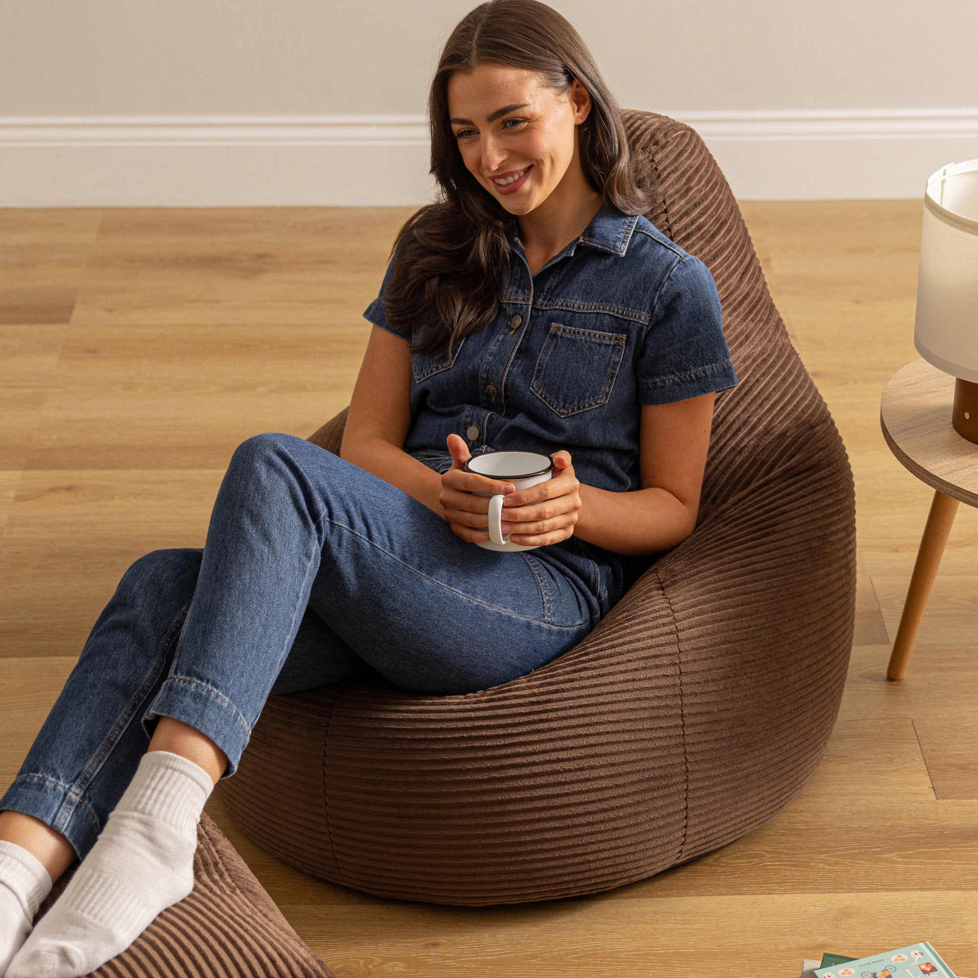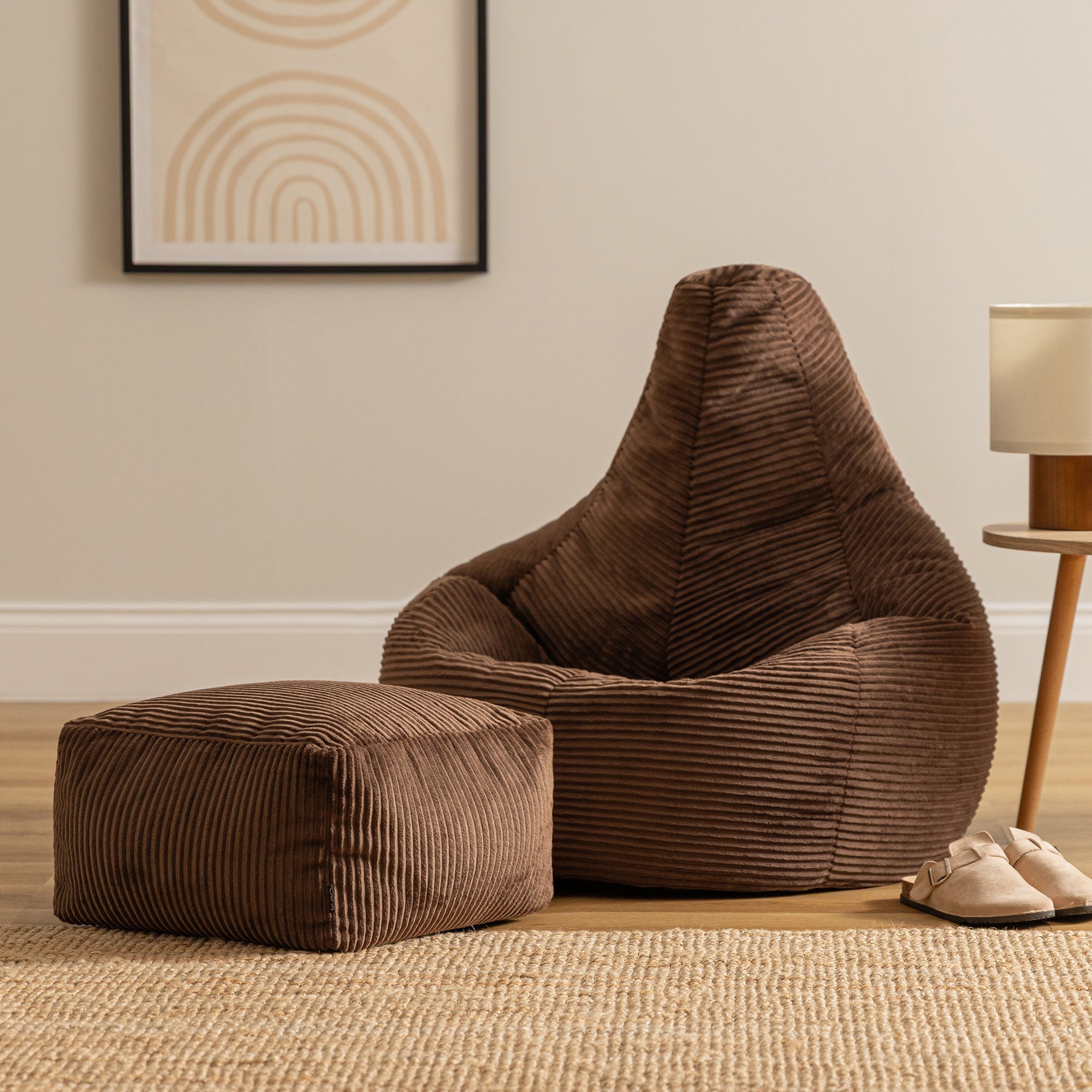 - Comfortabele zitzak met hoge rugleuning en bijpassende poef, gemaakt van het zachtste, OEKO-TEX-gecertificeerde ribfluweel