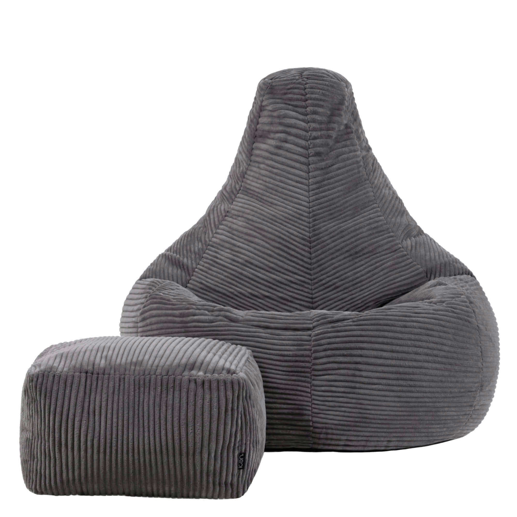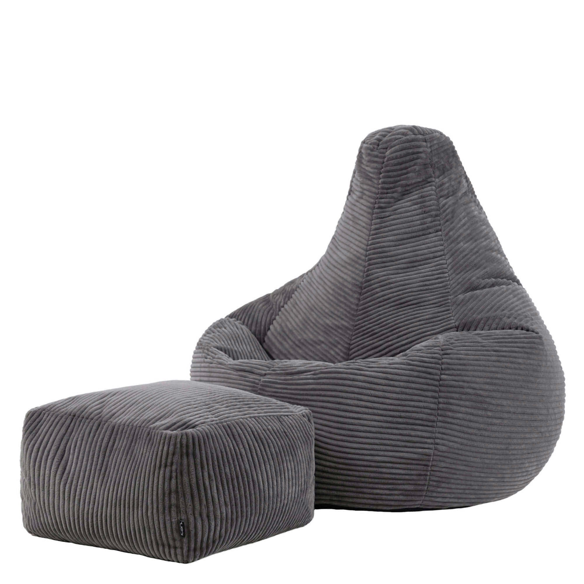 - Comfortabele zitzak met hoge rugleuning en bijpassende poef, gemaakt van het zachtste, OEKO-TEX-gecertificeerde ribfluweel