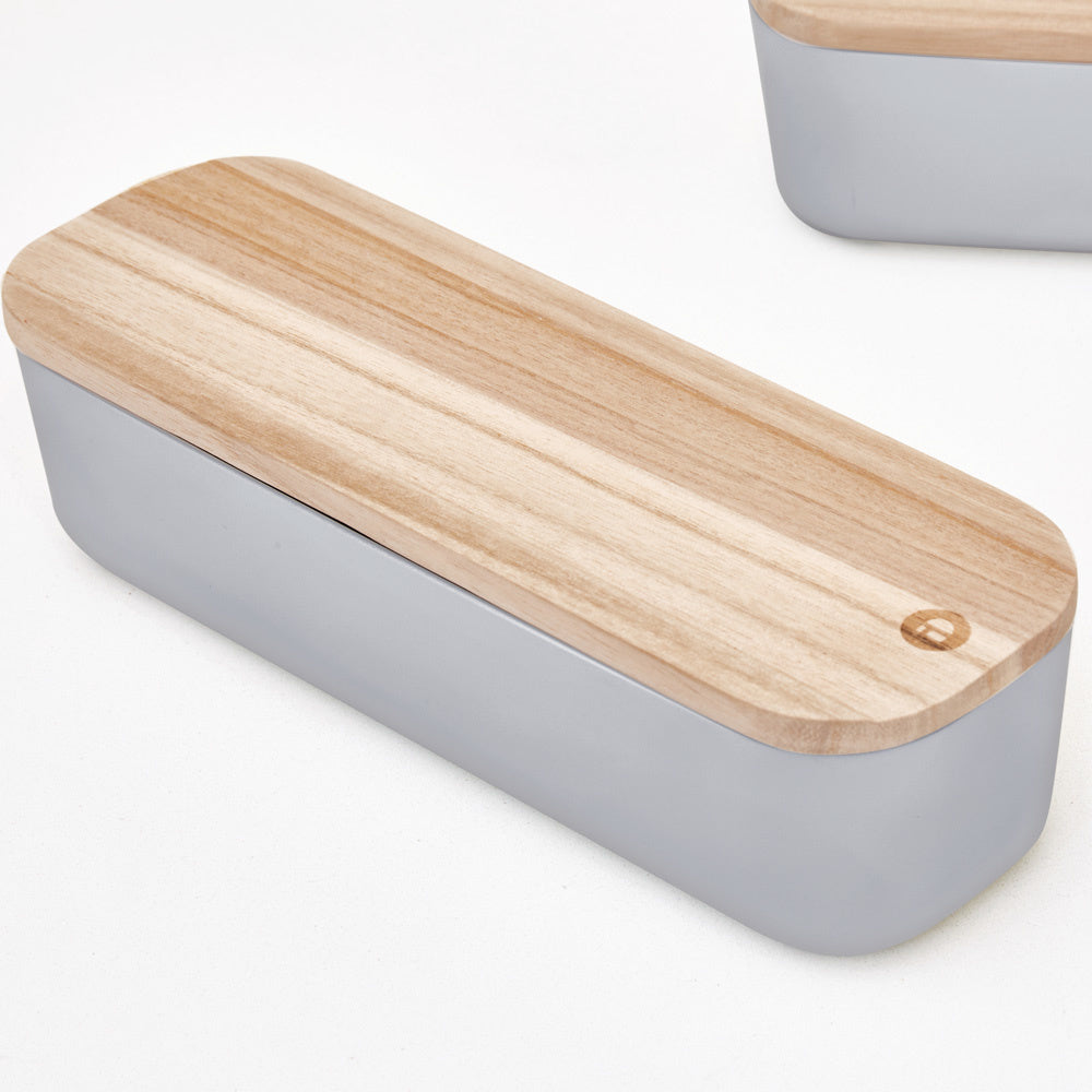 Opbergbox met Deksel, Large, 9 x 36.5 x 6 cm, Gerecycled Kunststof/Hout, Grijs - iDesign | Eco Storage Met deze opbergbox met deksel uit de Eco Storage serie van iDesign zorg je in iedere gewenste ruimte of lade voor dat extra beetje opbergruimte. De opbergbox is gemaakt van gerecycled kunststof en heeft een afmeting van 9 x 36.5 x 6 centimeter. Let op: de deksel van deze opbergbox is gemaakt van hout, deze is niet geschikt voor de vaatwasser. Het kunststof materiaal van de opbergbox zorgt ervoor dat deze eenvoudig schoon te maken en te houden is. Door de kleur en de vormgeving kan deze opbergbox op verschillende plekken gebruikt worden en zal hij volledig op gaan in de rest van de setting. Combineer deze opbergbox met deksel uit de Eco Storage serie van iDesign met de andere handige opbergboxen en opbergartikelen uit dezelfde serie voor een altijd opgeruimde en fantastische neutrale setting in iedere ruimte van je huis! Deze opbergbox is ook verkrijgbaar in het beige. Pluspunten: