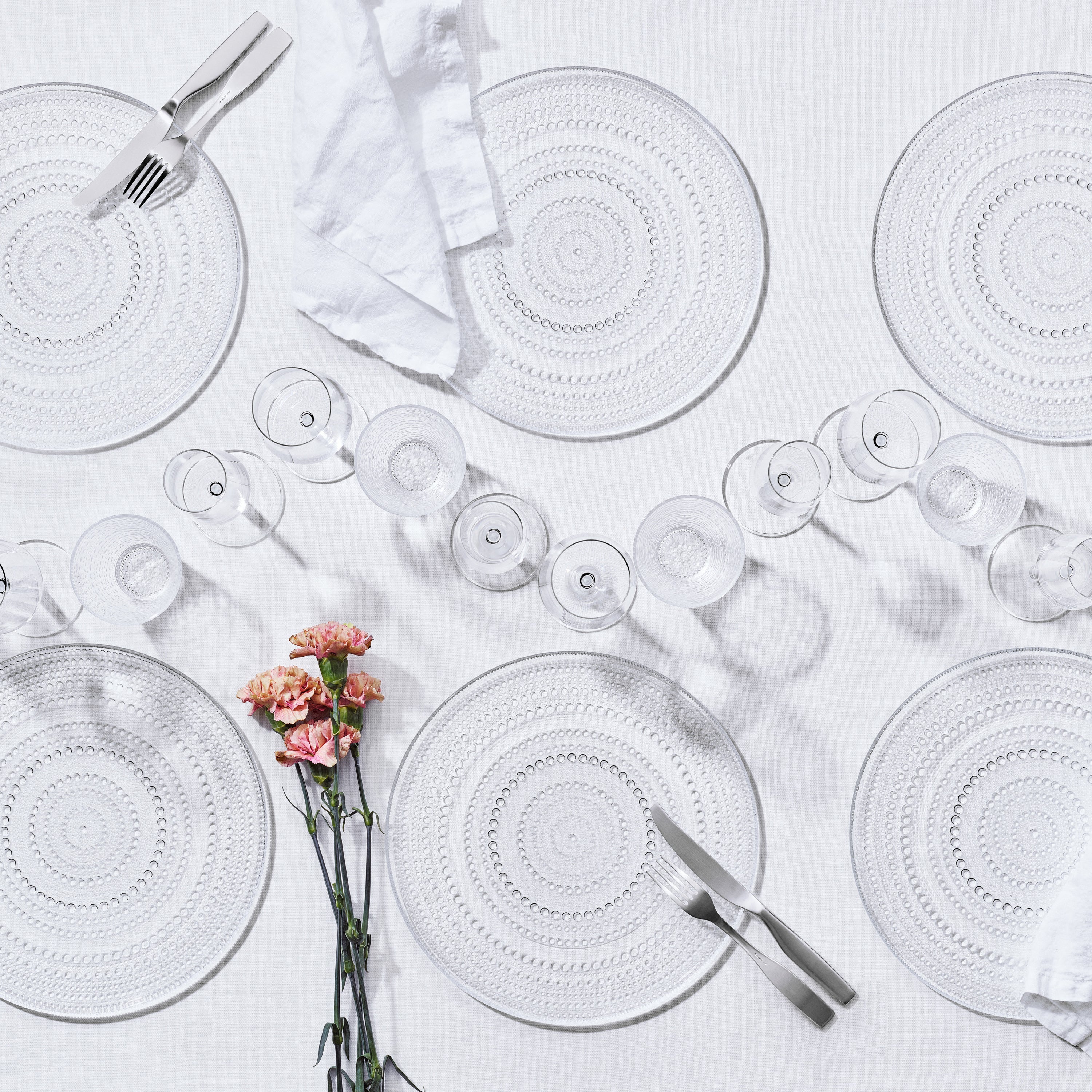 Dauwdruppel Kastehelmi is het Finse woord voor dauwdruppel en verwijst naar de bellen die zich in het geperste glas gevormd hebben. Het servies uit de Kastehelmi serie is gemaakt van hoogwaardig glaswerk en is vaatwasmachinebestendig.