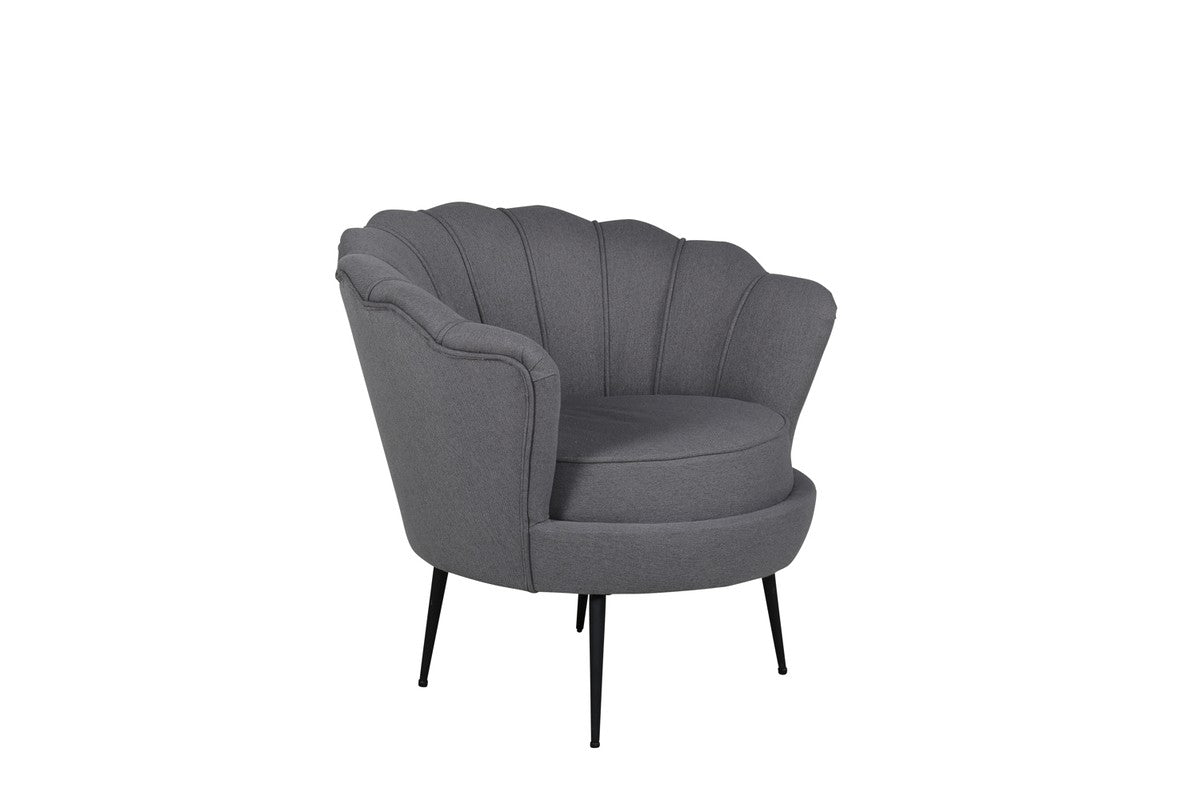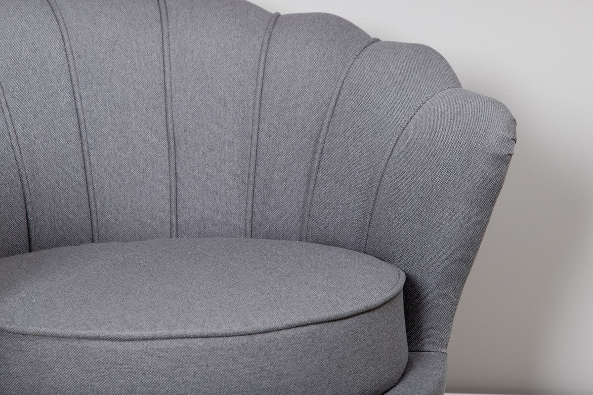 Ilora bewijst dat comfort en karakter perfect samengaan. De zachte grijze stof, de speelse schelpvorm en de subtiele verticale stiknaden geven deze fauteuil een elegante, retro vibe zonder oubollig te worden.
