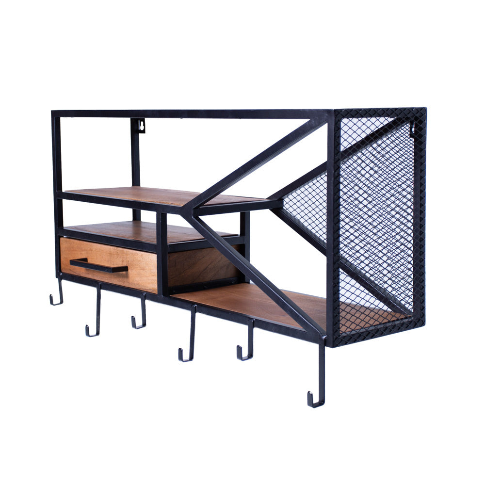 Wandrek Maggie is stoer, industrieel en een echte blikvanger! Het wandrek beschikt over vier leggers, 6 haken en bevat één lade. Daarnaast beschik dit rek over stoere details. Dit wandrek vindt aan elke wand een plekje!