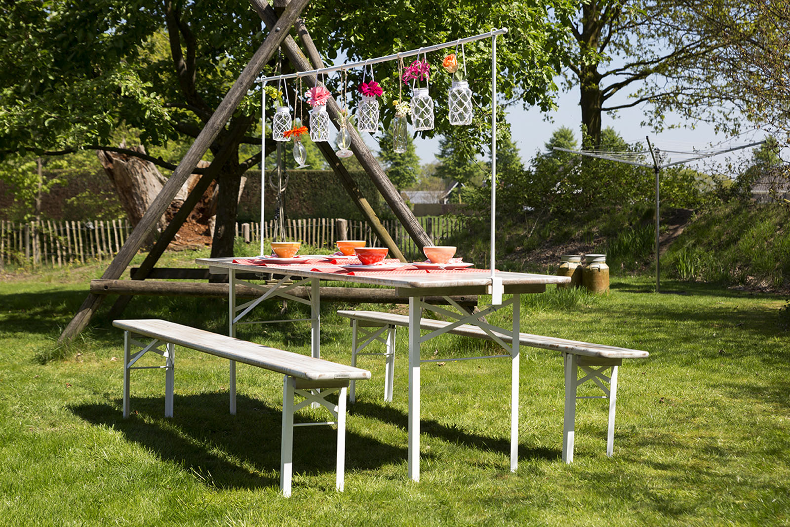 MaximaVida heeft van de welbekende Duitse bierbank een moderne picknickbank gemaakt door deze van een nieuw jasje te voorzien. De bank is voorzien van een whitewash verflaag waarbij de houtstructuur nog zichtbaar is. Deze stijlvolle inklapbare picknickbank is 200 cm lang en 25 cm breed. De bank binnen één minuut worden in- en uitgeklapt en is door zijn lengtemaat heel handig voor kleinere huizen, tuinen, balkons en dakterrassen. De inklapbare bank is zowel buiten als binnen te gebruiken.
