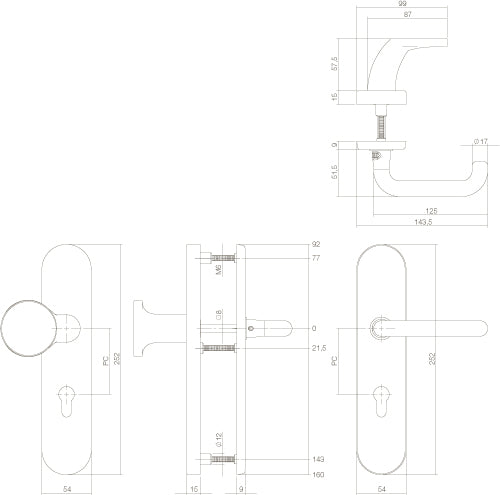- Verpakkingsinhoud: binnenschild met deurkruk, buitenschild met vaste greep, bevestigingsmateriaal en montagehandleiding