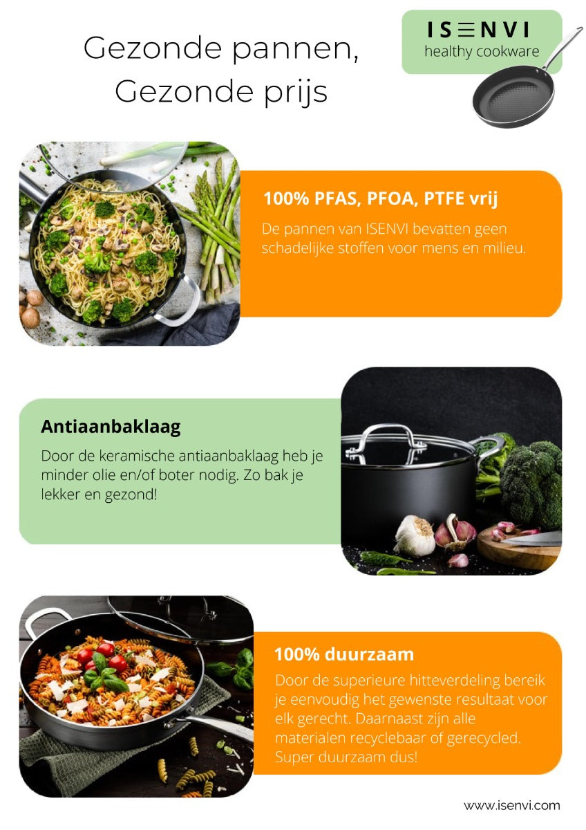 Voor pannen met een keramische antiaanbaklaag moet je bij ISENVI Healthy Cookware zijn. Door middel van onze expertise hebben wij een zorgvuldig samengesteld assortiment pannen en pannensets. Betrouwbare, betaalbare keramische pannen. Voor alle hittebronnen: inductie, elektrisch, gas en keramisch. Onze keramische pannen hebben een keramische antiaanbaklaag. Dat betekent dat er geen schadelijke stoffen worden vrijgegeven. Met een gerust hart koken! Bovendien ben je in onze keramische pannen minder boter en olie nodig. Veel gezonder dus! Of u nu op zoek bent naar inductie pannen of pannensets voor gas. Onze keramische pannen zijn altijd de beste keuze!