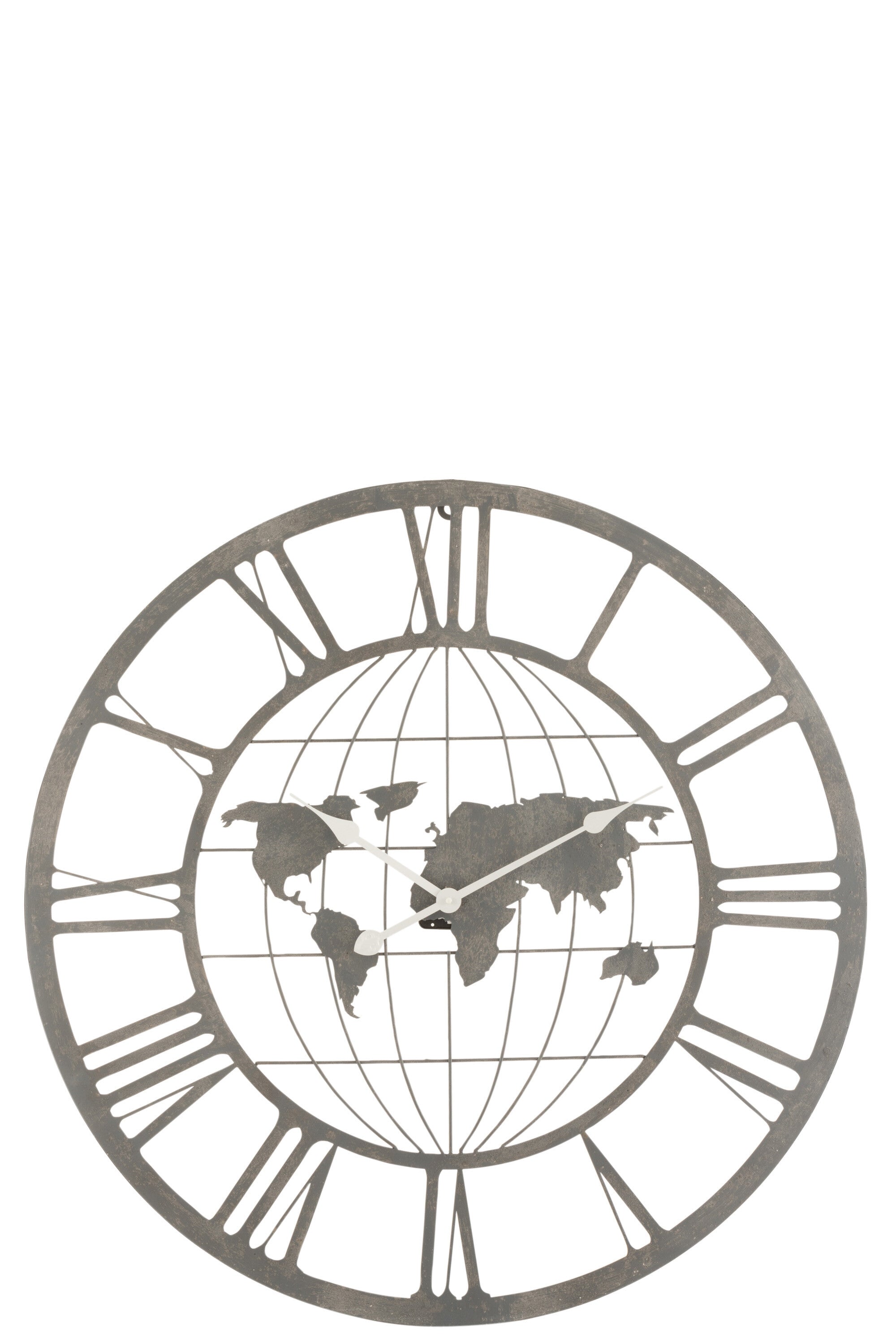 J-Line klok Romeinse Cijfers Wereldkaart - metaal - zwart - Ø 80 cm