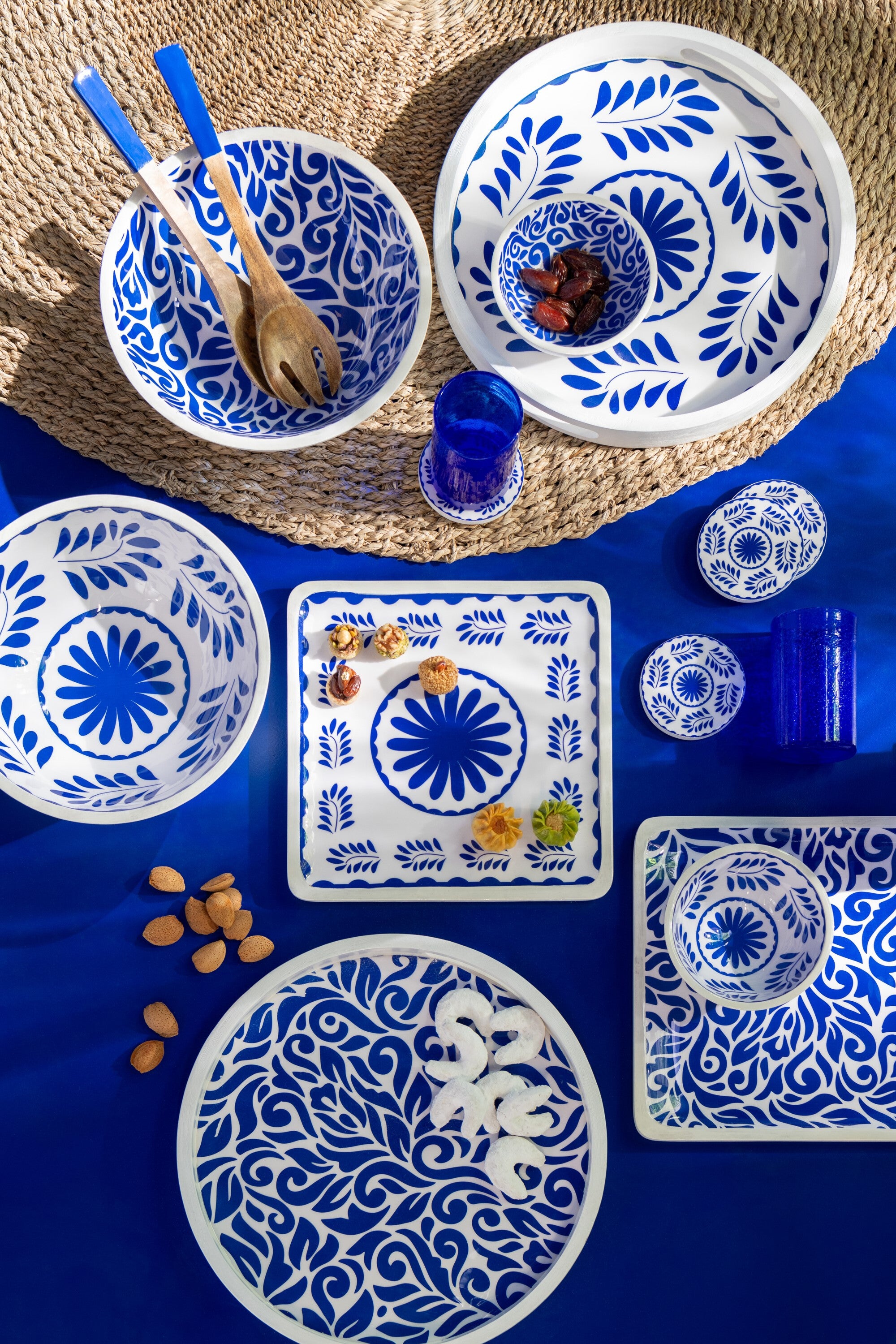 J-Line plateau Vierkant Bloemen - hout - blauw|wit - 2 stuks