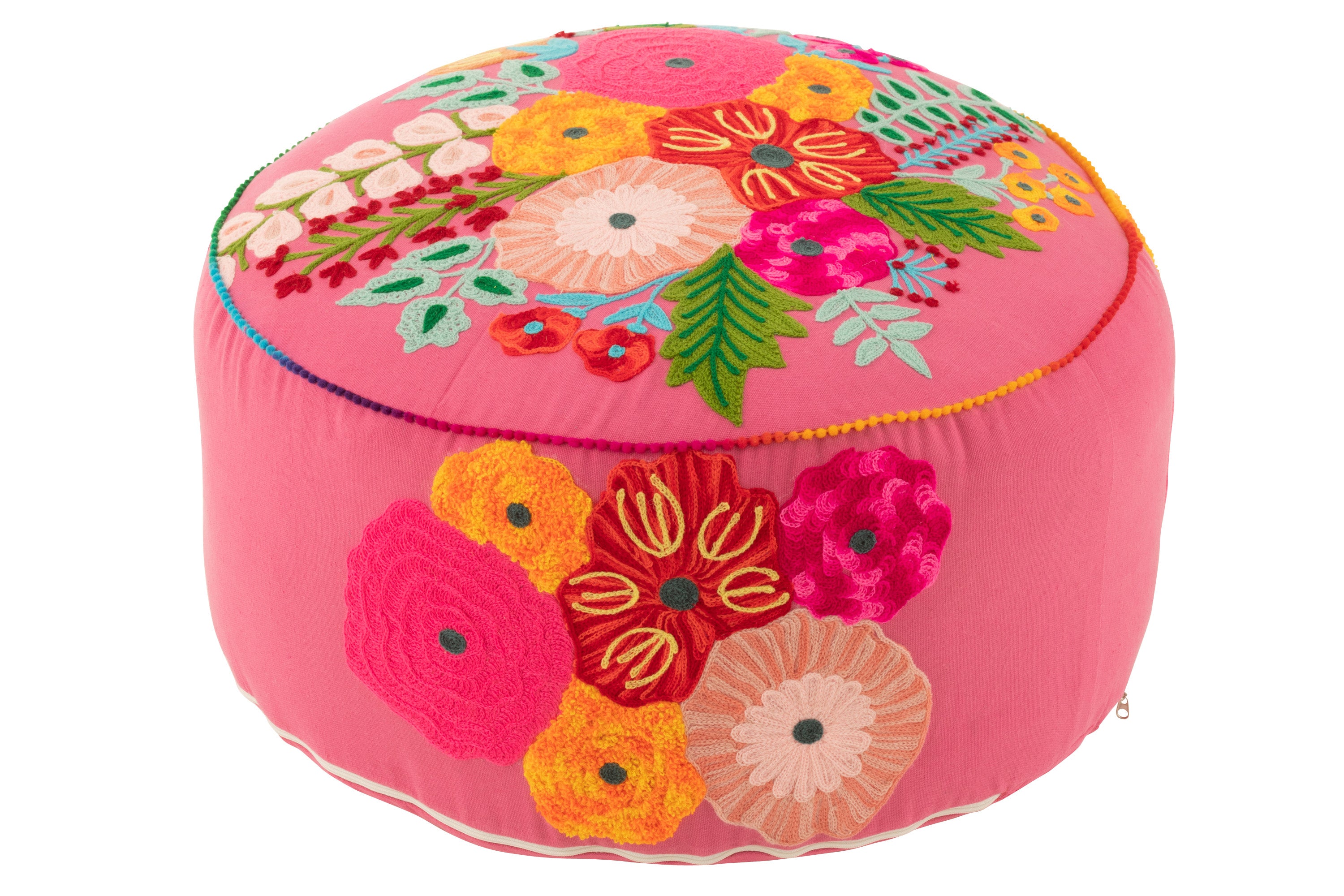 J-Line Poef Rond Bloemen Geborduurd Katoen|Polyester Roze