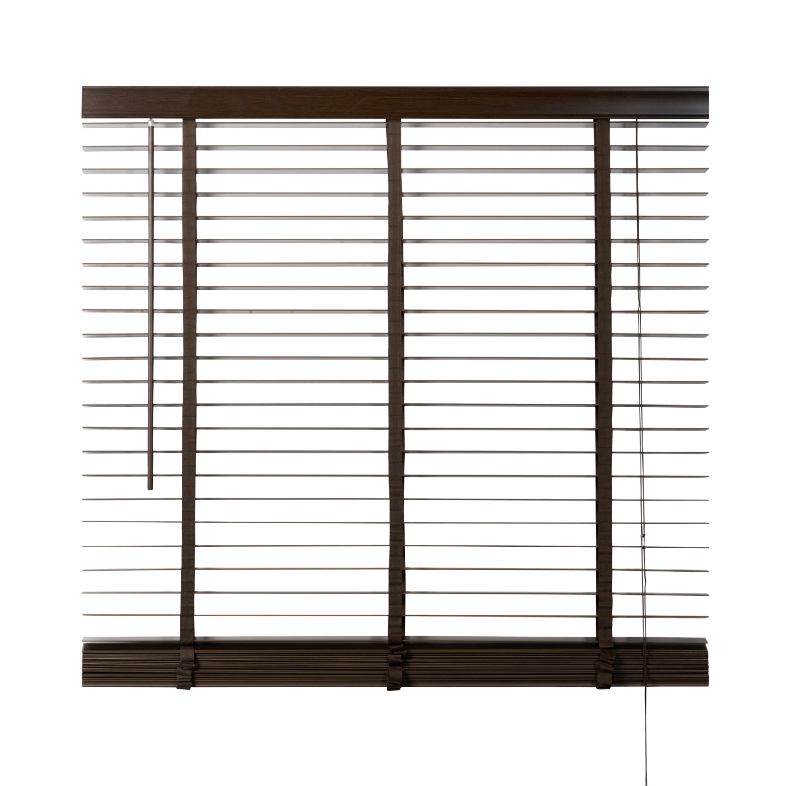 De lindehouten jaloezie in donkerbruine tint straalt warmte en klasse uit. Bovenop is er een aluminium cassette met een afdeklat, voorzien van een luxueus profiel voor een verfijnde afwerking. Zelfs de bedieningskoorden en verticale ladderbanden zijn in een bijpassende kleur, waardoor de jaloezie volledig in harmonie is met de bruine tint. De ladderbanden van 25 mm breed hebben een prachtige geweven textuur voor een extra fraai effect. Stylen met een bruine houten jaloezie: Een donkerbruine houten jaloezie brengt stijl en warmte in huis. De donkere houtkleur is eenvoudig te mixen met bijvoorbeeld wit- of poedertinten en aardse kleuren. Het kan precies de juiste dosis warmte toevoegen aan een eigentijds interieur. Zelfs in een boho omgeving met veel beige en natuurlijke kleuren zal een bruine houten jaloezie schitterend passen. Pluspunten: • Scherpe prijs voor perfecte kwaliteit en afwerking • Op en neer beweging door bedieningskoorden • Draaistang om te kantelen • Ophangsteunen voor eenvoudig montage • Makkelijk in te korten • Leverbaar in veel standaardmaten (60 tot 220 cm breed) • In zwart, wit en 2 trendy hout kleuren leverbaar Minpunten: • Verduistert niet volledig • Niet geschikt voor vochtige ruimtes, zoals een badkamer Welke maat heb ik nodig? Bedenk van tevoren of je de jaloezie "in of op de dag" wilt hangen, dus in of op het kozijn. Wanneer je ze in de dag hangt, heb je geen last van de zijkanten die na het versmallen onafgewerkt zullen zijn. Dat zit dan mooi verborgen. Het voordeel van op de dag monteren is dat het beter verduistert dan in de dag montage. Let op: het inmeten is een secuur klusje. We adviseren om altijd 2x te meten om vergissingen te voorkomen. Montage op de dag (op het plafond of vlak boven het raam) 1. Meet voor de breedte het raam op 3 plaatsen 2. Voeg daar aan beide kanten 5 cm extra aan toe 3. Meet voor de lengte de hoogte tot aan de vensterbank of tot aan de vloer. Houd rekening met de hoogte van het ophangsysteem 4. Trek hier 1 cm vanaf Montage in de dag (tussen de kozijnen) 1. Houd rekening met draaiende en uitstekende delen, zoals hendels en grepen 2. Meet de breedte tussen het kozijn of de muren op 3 plaatsen 3. De breedte is de smalst gemeten maat. Trek hier 1 cm vanaf 4. Meet de lengte tussen het kozijn of muur en de vensterbank op 3 plaatsen 5. De lengte is de kortst gemeten maat. Indien je de jaloezie tot op de vensterbank wilt, trek er dan 1 cm vanaf Eenvoudige montage: 1. Volg eerst bovenstaande stappen voor het correct meten van de juiste maat jaloezie. 2. Meet en teken de plaats af waar de ophangsteunen moeten komen 3. Zorg dat er genoeg speling is voor wanneer je de cassette met jaloezie in de steunen hangt. 4. Hang de extra beugel ter ondersteuning op, maar niet in het midden. Anders zit deze beugel op dezelfde plek als het ladderband. 5. Hang de jaloezie op door de cassette in de ophangsteunen te hangen en klik deze dicht. 6. Bevestig de ophangbeugels aan de afdeklat en schuif de afdeklat met beugels op de cassette. Je kunt gebruik maken van het dubbelzijdige tape om de afdeklat vast te maken. 7. Indien nodig kun je de lengte van de jaloezie inkorten (zie onderstaande stappen). Lengte jaloezie inkorten: 1. Hang de jaloezie languit naar beneden bij het op maat maken van de lengte. Zo kun je goed bepalen hoeveel lamellen er tussenuit moeten voor de juiste lengte. 2. Aan de onderzijde zitten doppen ter afwerking van het katoenen ladderband en het koord. Deze doppen kun je er makkelijk met je vingers of anders met een platte schroevendraaier uitduwen. 3. Na het weghalen van de doppen worden de knoopjes van de koorden zichtbaar. Het is soms even friemelen, maar haal de knopen los. 4. Nu zie je vaak meteen hoeveel lamellen er tussenuit moeten. Verwijder eerst de onderste, wat bredere, afwerk lamel en daarna het teveel aan lamellen. Schuif de brede afwerklamel weer tussen het ladderband en rijg het koord er doorheen. Maak de knoopjes opnieuw vast. 5. Knip het ladderband op de juiste lengte af. Zorg ervoor dat je dat niet te kort doet. Check onderaan even hoe dat eerder gedaan is en knip op dezelfde wijze het teveel aan band af. Plaats het ladderband met de doppen weer terug in de afwerk lamel, precies zoals het eerst zat. 6. Als finishing touch kun je ook het bedieningskoord op de juiste lengte maken. Duw de houten klosjes omhoog en knoop het koord hoger (op de juiste lengte) weer vast. Knip het overtollige koord aan de onderkant af en duw de klosjes weer terug naar beneden over de knoopjes heen. Nu is de look helemaal af. Onderhoud: Om je houten jaloezie in topvorm te houden is regelmatig onderhoud belangrijk. Om ze snel op te frissen gebruik je een stofdoek, plumeau of de stofzuiger. Draai de jaloezieën dicht en ga er met een stofdoek of plumeau overheen. Het kan ook met de stofzuiger, zet ‘m dan wel op de laagste stand en gebruik een kleine opzetborstel. Voor een wat diepere reiniging kun je de lamellen afnemen met een licht vochtige doek en een zacht reinigingsmiddel.| Afmetingen | |