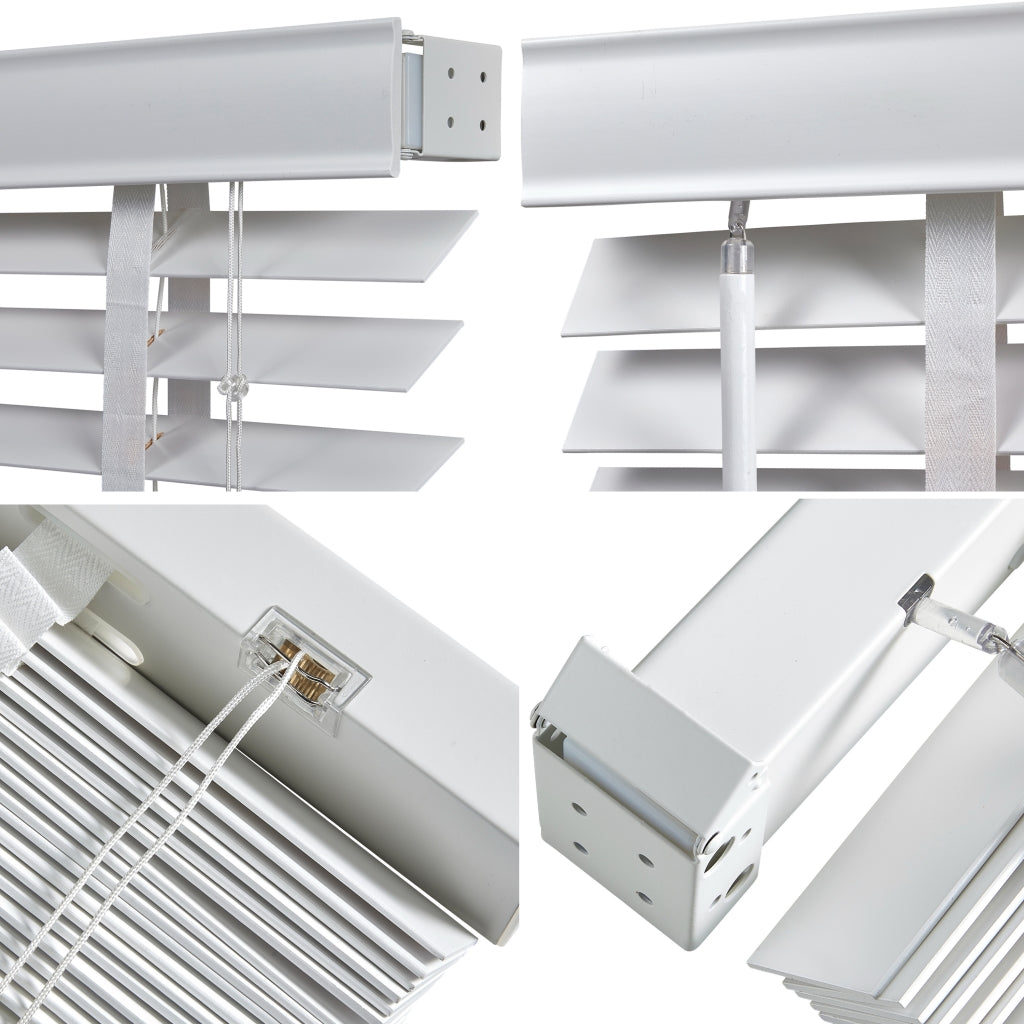 De witte jaloezie van lindehout heeft een egale structuur zonder zichtbare houtnerf. Bovenop bevindt zich een aluminium cassette met een witte afdeklat, voorzien van een luxe profiel voor een verfijnde afwerking. Ook de bedieningskoorden en verticale ladderbanden zijn wit, waardoor de jaloezie volledig in dezelfde witte kleur is uitgevoerd. De ladderbanden, met een breedte van 25 mm, hebben een prachtige geweven structuur. Stylen met een witte houten jaloezie: Een houten jaloezie in het wit brengt een kalme en frisse sfeer in huis. Het witte hout past uitstekend bij een landelijke uitstraling met natuurlijk hout en diverse texturen zoals wol, bouclé en linnen. Ook in een minimalistische Scandinavische stijl voegt een witte jaloezie de perfecte touch toe aan je interieur. Een witte jaloezie op een wit kozijn kan tevens zorgen voor een ideale basislook, vooral als je graag met de trends meegaat en je interieur regelmatig wilt aanpassen. Pluspunten: • Scherpe prijs voor perfecte kwaliteit en afwerking • Op en neer beweging door bedieningskoorden • Draaistang om te kantelen • Ophangsteunen voor eenvoudig montage • Makkelijk in te korten • Leverbaar in veel standaardmaten (60 tot 220 cm breed) • In zwart, wit en 2 trendy hout kleuren leverbaar Minpunten: • Verduistert niet volledig • Niet geschikt voor vochtige ruimtes, zoals een badkamer Welke maat heb ik nodig? Bedenk van tevoren of je de jaloezie "in of op de dag" wilt hangen, dus in of op het kozijn. Wanneer je ze in de dag hangt, heb je geen last van de zijkanten die na het versmallen onafgewerkt zullen zijn. Dat zit dan mooi verborgen. Het voordeel van op de dag monteren is dat het beter verduistert dan in de dag montage. Let op: het inmeten is een secuur klusje. We adviseren om altijd 2x te meten om vergissingen te voorkomen. Montage op de dag (op het plafond of vlak boven het raam) 1. Meet voor de breedte het raam op 3 plaatsen 2. Voeg daar aan beide kanten 5 cm extra aan toe 3. Meet voor de lengte de hoogte tot aan de vensterbank of tot aan de vloer. Houd rekening met de hoogte van het ophangsysteem 4. Trek hier 1 cm vanaf Montage in de dag (tussen de kozijnen) 1. Houd rekening met draaiende en uitstekende delen, zoals hendels en grepen 2. Meet de breedte tussen het kozijn of de muren op 3 plaatsen 3. De breedte is de smalst gemeten maat. Trek hier 1 cm vanaf 4. Meet de lengte tussen het kozijn of muur en de vensterbank op 3 plaatsen 5. De lengte is de kortst gemeten maat. Indien je de jaloezie tot op de vensterbank wilt, trek er dan 1 cm vanaf Eenvoudige montage: 1. Volg eerst bovenstaande stappen voor het correct meten van de juiste maat jaloezie. 2. Meet en teken de plaats af waar de ophangsteunen moeten komen. 3. Zorg dat er genoeg speling is voor wanneer je de cassette met jaloezie in de steunen hangt. 4. Hang de extra beugel ter ondersteuning op, maar niet in het midden. Anders zit deze beugel op dezelfde plek als het ladderband. 5. Hang de jaloezie op door de cassette in de ophangsteunen te hangen en klik deze dicht. 6. Bevestig de ophangbeugels aan de afdeklat en schuif de afdeklat met beugels op de cassette. Je kunt gebruik maken van het dubbelzijdige tape om de afdeklat vast te maken. 7. Indien nodig kun je de lengte van de jaloezie inkorten (zie onderstaande stappen). Lengte jaloezie inkorten: 1. Hang de jaloezie languit naar beneden bij het op maat maken van de lengte. Zo kun je goed bepalen hoeveel lamellen er tussenuit moeten voor de juiste lengte. 2. Aan de onderzijde zitten doppen ter afwerking van het katoenen ladderband en het koord. Deze doppen kun je er makkelijk met je vingers of anders met een platte schroevendraaier uitduwen. 3. Na het weghalen van de doppen worden de knoopjes van de koorden zichtbaar. Het is soms even friemelen, maar haal de knopen los. 4. Nu zie je vaak meteen hoeveel lamellen er tussenuit moeten. Verwijder eerst de onderste, wat bredere, afwerk lamel en daarna het teveel aan lamellen. Schuif de brede afwerklamel weer tussen het ladderband en rijg het koord er doorheen. Maak de knoopjes opnieuw vast. 5. Knip het ladderband op de juiste lengte af. Zorg ervoor dat je dat niet te kort doet. Check onderaan even hoe dat eerder gedaan is en knip op dezelfde wijze het teveel aan band af. Plaats het ladderband met de doppen weer terug in de afwerk lamel, precies zoals het eerst zat. 6. Als finishing touch kun je ook het bedieningskoord op de juiste lengte maken. Duw de houten klosjes omhoog en knoop het koord hoger (op de juiste lengte) weer vast. Knip het overtollige koord aan de onderkant af en duw de klosjes weer terug naar beneden over de knoopjes heen. Nu is de look helemaal af. Onderhoud: Om je houten jaloezie in topvorm te houden is regelmatig onderhoud belangrijk. Om ze snel op te frissen gebruik je een stofdoek, plumeau of de stofzuiger. Draai de jaloezieën dicht en ga er met een stofdoek of plumeau overheen. Het kan ook met de stofzuiger, zet ‘m dan wel op de laagste stand en gebruik een kleine opzetborstel. Voor een wat diepere reiniging kun je de lamellen afnemen met een licht vochtige doek en een zacht reinigingsmiddel.| Afmetingen | |