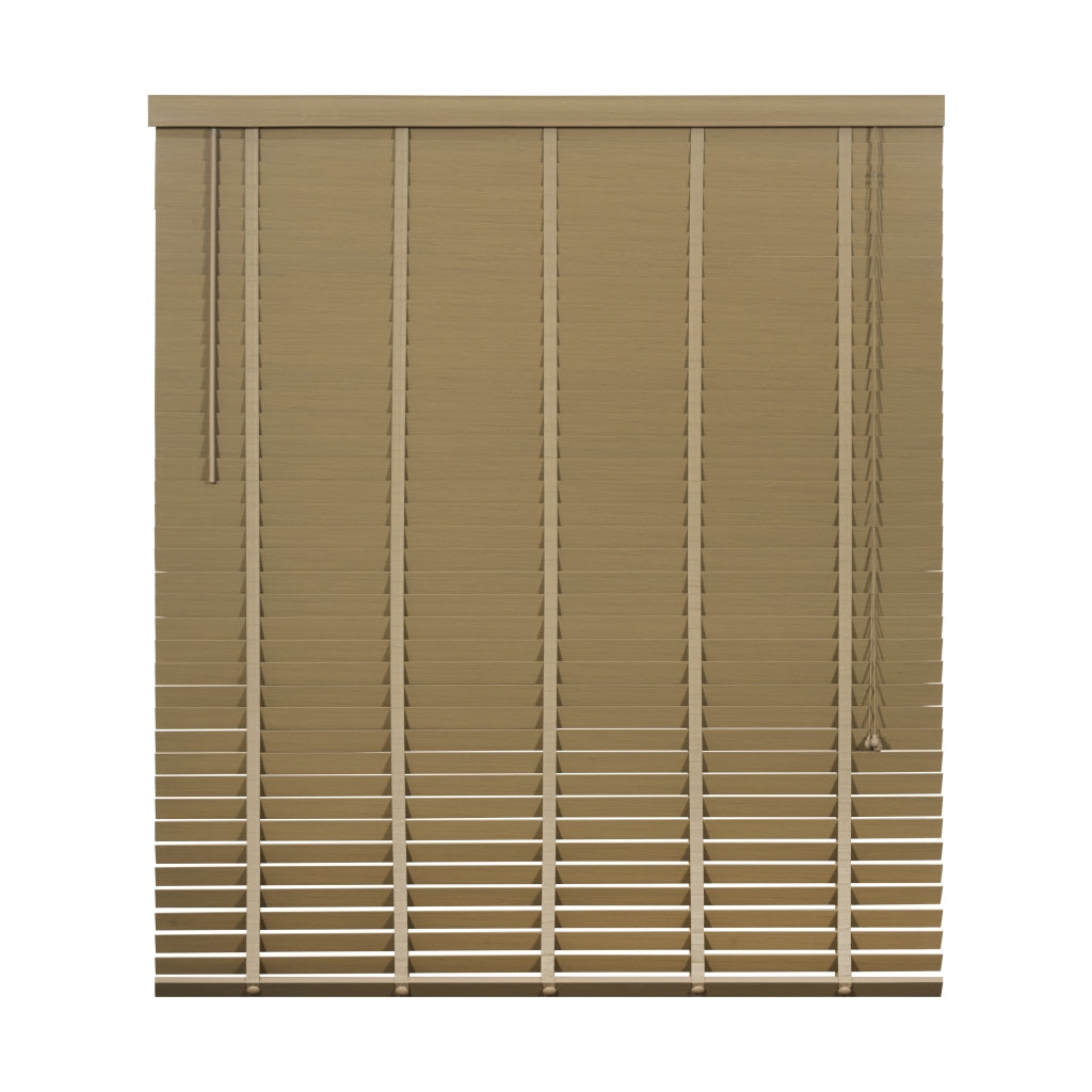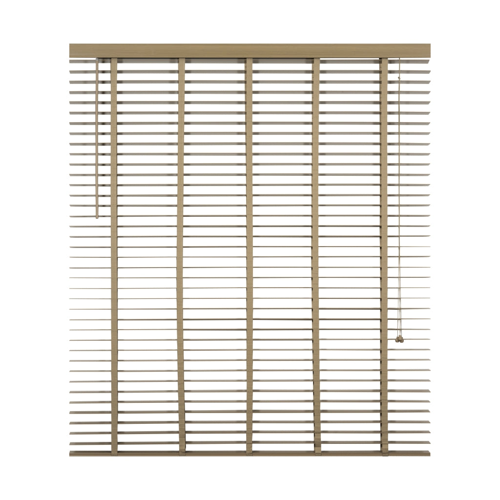 De lindehouten jaloezie in taupe tint straalt warmte uit met zijn natuurlijke vergrijsde look. Bovenop is er een aluminium cassette met een afdeklat, voorzien van een luxueus profiel voor een verfijnde afwerking. Zelfs de bedieningskoorden en verticale ladderbanden zijn in een bijpassende kleur, waardoor de jaloezie volledig in harmonie is met de taupe tint. De ladderbanden van 25 mm breed hebben een prachtige geweven textuur voor een extra fraai effect. Stylen met een taupe houten jaloezie: Een houten jaloezie in taupe tint brengt stijl en warmte in huis. De verweerde houtkleur is eenvoudig te mixen met bijvoorbeeld grijze en zachte pasteltinten. Het kan precies de juiste dosis warmte toevoegen aan een eigentijds interieur. Zelfs in een boho omgeving met veel beige en natuurlijke kleuren zal een taupe houten jaloezie schitterend passen. Pluspunten: • Scherpe prijs voor perfecte kwaliteit en afwerking • Op en neer beweging door bedieningskoorden • Draaistang om te kantelen • Ophangsteunen voor eenvoudig montage • Makkelijk in te korten • Leverbaar in veel standaardmaten (60 tot 220 cm breed) • In 2 trendy hout kleuren en basic zwart en wit leverbaar Minpunten: • Verduistert niet volledig • Niet geschikt voor vochtige ruimtes, zoals een badkamer Welke maat heb ik nodig? Bedenk van tevoren of je de jaloezie "in of op de dag" wilt hangen, dus in of op het kozijn. Wanneer je ze in de dag hangt, heb je geen last van de zijkanten die na het versmallen onafgewerkt zullen zijn. Dat zit dan mooi verborgen. Het voordeel van op de dag monteren is dat het beter verduistert dan in de dag montage. Let op: het inmeten is een secuur klusje. We adviseren om altijd 2x te meten om vergissingen te voorkomen. Montage op de dag (op het plafond of vlak boven het raam) 1. Meet voor de breedte het raam op 3 plaatsen 2. Voeg daar aan beide kanten 5 cm extra aan toe 3. Meet voor de lengte de hoogte tot aan de vensterbank of tot aan de vloer. Houd rekening met de hoogte van het ophangsysteem 4. Trek hier 1 cm vanaf Montage in de dag (tussen de kozijnen) 1. Houd rekening met draaiende en uitstekende delen, zoals hendels en grepen 2. Meet de breedte tussen het kozijn of de muren op 3 plaatsen 3. De breedte is de smalst gemeten maat. Trek hier 1 cm vanaf 4. Meet de lengte tussen het kozijn of muur en de vensterbank op 3 plaatsen 5. De lengte is de kortst gemeten maat. Indien je de jaloezie tot op de vensterbank wilt, trek er dan 1 cm vanaf Eenvoudige montage: 1. Volg eerst bovenstaande stappen voor het correct meten van de juiste maat jaloezie. 2. Meet en teken de plaats af waar de ophangsteunen moeten komen. 3. Zorg dat er genoeg speling is voor wanneer je de cassette met jaloezie in de steunen hangt. 4. Hang de extra beugel ter ondersteuning op, maar niet in het midden. Anders zit deze beugel op dezelfde plek als het ladderband. 5. Hang de jaloezie op door de cassette in de ophangsteunen te hangen en klik deze dicht. 6. Bevestig de ophangbeugels aan de afdeklat en schuif de afdeklat met beugels op de cassette. Je kunt gebruik maken van het dubbelzijdige tape om de afdeklat vast te maken. 7. Indien nodig kun je de lengte van de jaloezie inkorten (zie onderstaande stappen). Lengte jaloezie inkorten: 1. Hang de jaloezie languit naar beneden bij het op maat maken van de lengte. Zo kun je goed bepalen hoeveel lamellen er tussenuit moeten voor de juiste lengte. 2. Aan de onderzijde zitten doppen ter afwerking van het katoenen ladderband en het koord. Deze doppen kun je er makkelijk met je vingers of anders met een platte schroevendraaier uitduwen. 3. Na het weghalen van de doppen worden de knoopjes van de koorden zichtbaar. Het is soms even friemelen, maar haal de knopen los. 4. Nu zie je vaak meteen hoeveel lamellen er tussenuit moeten. Verwijder eerst de onderste, wat bredere, afwerk lamel en daarna het teveel aan lamellen. Schuif de brede afwerklamel weer tussen het ladderband en rijg het koord er doorheen. Maak de knoopjes opnieuw vast. 5. Knip het ladderband op de juiste lengte af. Zorg ervoor dat je dat niet te kort doet. Check onderaan even hoe dat eerder gedaan is en knip op dezelfde wijze het teveel aan band af. Plaats het ladderband met de doppen weer terug in de afwerk lamel, precies zoals het eerst zat. 6. Als finishing touch kun je ook het bedieningskoord op de juiste lengte maken. Duw de houten klosjes omhoog en knoop het koord hoger (op de juiste lengte) weer vast. Knip het overtollige koord aan de onderkant af en duw de klosjes weer terug naar beneden over de knoopjes heen. Nu is de look helemaal af. Onderhoud: Om je houten jaloezie in topvorm te houden is regelmatig onderhoud belangrijk. Om ze snel op te frissen gebruik je een stofdoek, plumeau of de stofzuiger. Draai de jaloezieën dicht en ga er met een stofdoek of plumeau overheen. Het kan ook met de stofzuiger, zet ‘m dan wel op de laagste stand en gebruik een kleine opzetborstel. Voor een wat diepere reiniging kun je de lamellen afnemen met een licht vochtige doek en een zacht reinigingsmiddel.| Afmetingen | |