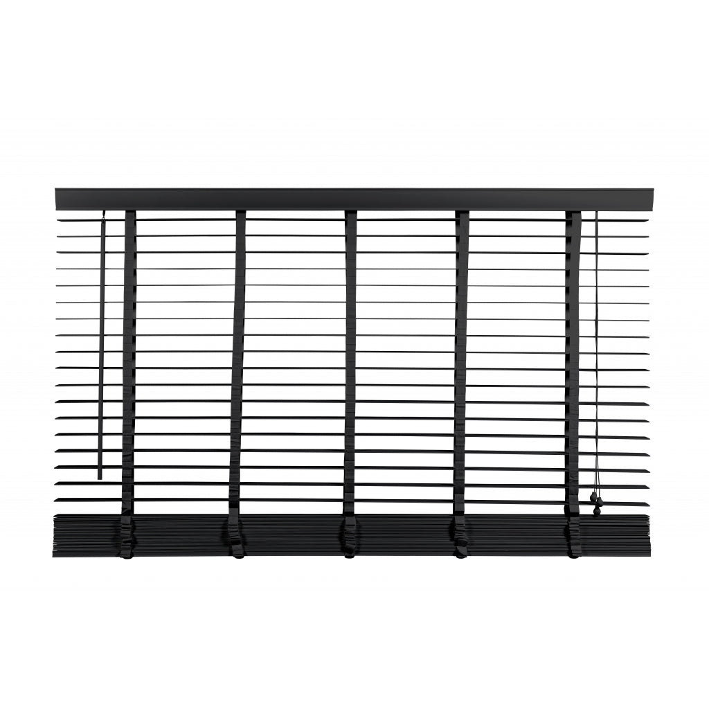 De zwarte jaloezie van lindehout heeft een egale structuur zonder zichtbare houtnerf. Bovenop bevindt zich een aluminium cassette met een zwarte afdeklat, voorzien van een luxe profiel voor een verfijnde afwerking. Ook de bedieningskoorden en verticale ladderbanden zijn zwart, waardoor de jaloezie volledig in dezelfde zwarte kleur is uitgevoerd. De ladderbanden, met een breedte van 25 mm, hebben een prachtige geweven structuur. Stylen met een zwarte houten jaloezie: Een jaloezie in het zwart is een echte blikvanger in je interieur. De diepe kleur creëert een gezellige en elegante sfeer. Het is prachtig om het zwart op verschillende plekken te laten terugkomen. Dat kan bijvoorbeeld in de vorm van een mooie zwarte kast, zwarte lampen of zwarte woonaccessoires. Deze uitstraling past perfect bij een stoere woonstijl met veel hout en planten, maar ook in een minimalistische setting met grijstinten en strak wit. Een zwarte houten jaloezie voegt een sfeervolle en eigentijdse twist toe. Pluspunten: • Scherpe prijs voor perfecte kwaliteit en afwerking • Op en neer beweging door bedieningskoorden • Draaistang om te kantelen • Ophangsteunen voor eenvoudig montage • Makkelijk in te korten • Leverbaar in veel standaardmaten (60 tot 220 cm breed) • In zwart, wit en 2 trendy hout kleuren leverbaar Minpunten: • Verduistert niet volledig • Niet geschikt voor vochtige ruimtes, zoals een badkamer Welke maat heb ik nodig? Bedenk van tevoren of je de jaloezie "in of op de dag" wilt hangen, dus in of op het kozijn. Wanneer je ze in de dag hangt, heb je geen last van de zijkanten die na het versmallen onafgewerkt zullen zijn. Dat zit dan mooi verborgen. Het voordeel van op de dag monteren is dat het beter verduistert dan in de dag montage. Let op: het inmeten is een secuur klusje. We adviseren om altijd 2x te meten om vergissingen te voorkomen. Montage op de dag (op het plafond of vlak boven het raam) 1. Meet voor de breedte het raam op 3 plaatsen 2. Voeg daar aan beide kanten 5 cm extra aan toe 3. Meet voor de lengte de hoogte tot aan de vensterbank of tot aan de vloer. Houd rekening met de hoogte van het ophangsysteem 4. Trek hier 1 cm vanaf Montage in de dag (tussen de kozijnen) 1. Houd rekening met draaiende en uitstekende delen, zoals hendels en grepen 2. Meet de breedte tussen het kozijn of de muren op 3 plaatsen 3. De breedte is de smalst gemeten maat. Trek hier 1 cm vanaf 4. Meet de lengte tussen het kozijn of muur en de vensterbank op 3 plaatsen 5. De lengte is de kortst gemeten maat. Indien je de jaloezie tot op de vensterbank wilt, trek er dan 1 cm vanaf Eenvoudige montage: 1. Volg eerst bovenstaande stappen voor het correct meten van de juiste maat jaloezie. 2. Meet en teken de plaats af waar de ophangsteunen moeten komen 3. Zorg dat er genoeg speling is voor wanneer je de cassette met jaloezie in de steunen hangt. 4. Hang de extra beugel ter ondersteuning op, maar niet in het midden. Anders zit deze beugel op dezelfde plek als het ladderband. 5. Hang de jaloezie op door de cassette in de ophangsteunen te hangen en klik deze dicht. 6. Bevestig de ophangbeugels aan de afdeklat en schuif de afdeklat met beugels op de cassette. Je kunt gebruik maken van het dubbelzijdige tape om de afdeklat vast te maken. 7. Indien nodig kun je de lengte van de jaloezie inkorten (zie onderstaande stappen). Lengte jaloezie inkorten: 1. Hang de jaloezie languit naar beneden bij het op maat maken van de lengte. Zo kun je goed bepalen hoeveel lamellen er tussenuit moeten voor de juiste lengte. 2. Aan de onderzijde zitten doppen ter afwerking van het katoenen ladderband en het koord. Deze doppen kun je er makkelijk met je vingers of anders met een platte schroevendraaier uitduwen. 3. Na het weghalen van de doppen worden de knoopjes van de koorden zichtbaar. Het is soms even friemelen, maar haal de knopen los. 4. Nu zie je vaak meteen hoeveel lamellen er tussenuit moeten. Verwijder eerst de onderste, wat bredere, afwerk lamel en daarna het teveel aan lamellen. Schuif de brede afwerklamel weer tussen het ladderband en rijg het koord er doorheen. Maak de knoopjes opnieuw vast. 5. Knip het ladderband op de juiste lengte af. Zorg ervoor dat je dat niet te kort doet. Check onderaan even hoe dat eerder gedaan is en knip op dezelfde wijze het teveel aan band af. Plaats het ladderband met de doppen weer terug in de afwerk lamel, precies zoals het eerst zat. 6. Als finishing touch kun je ook het bedieningskoord op de juiste lengte maken. Duw de houten klosjes omhoog en knoop het koord hoger (op de juiste lengte) weer vast. Knip het overtollige koord aan de onderkant af en duw de klosjes weer terug naar beneden over de knoopjes heen. Nu is de look helemaal af. Onderhoud: Om je houten jaloezie in topvorm te houden is regelmatig onderhoud belangrijk. Om ze snel op te frissen gebruik je een stofdoek, plumeau of de stofzuiger. Draai de jaloezieën dicht en ga er met een stofdoek of plumeau overheen. Het kan ook met de stofzuiger, zet ‘m dan wel op de laagste stand en gebruik een kleine opzetborstel. Voor een wat diepere reiniging kun je de lamellen afnemen met een licht vochtige doek en een zacht reinigingsmiddel.| Afmetingen | |
