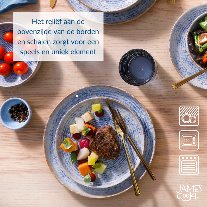 Belangrijkste kenmerken: · Product: 2 diepe borden · Diameter: 22 cm · Serie: Azure Vintage · Kleur: Wit, blauw en een bruine randdetaillering · Materiaal: Stoneware · Vaatwasmachinebestendig: Ja · Hittebestendig: Ja, tot 220℃ · Vriezerbestendig: Nee Stoneware Stoneware is een stoer en robuust materiaal. Stoneware is een type porselein gemaakt van klei met een fijne korrel gebakken op 1000 á 1100°C. Door dit materiaal op een hoge temperatuur te bakken is het sterker dan doorsnee aardewerk en daardoor zeer geschikt voor dagelijks gebruik. Daarnaast kan stoneware in de oven, de magnetron en de vaatwasser. Ook is dit materiaal kleur- en geurbestendig.