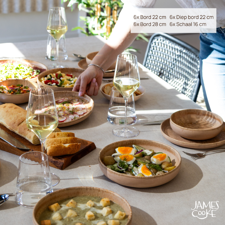 Inhoud van deze set: · 6 dinerborden (28 cm) – Ideaal voor hoofdgerechten en uitgebreide diners · 6 (ontbijt)borden (22 cm) – Geschikt voor ontbijt, lunch of desserts · 6 diepe borden (22 cm) – Perfect voor soepen, pasta’s en andere vloeibare gerechten · 6 schalen (16 cm, 60 cl) – Ideaal voor bijgerechten, snacks of salades