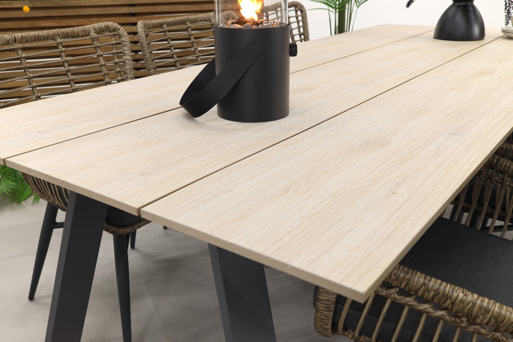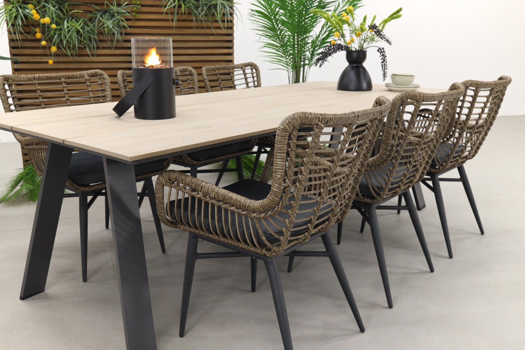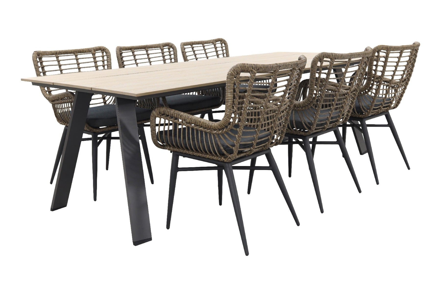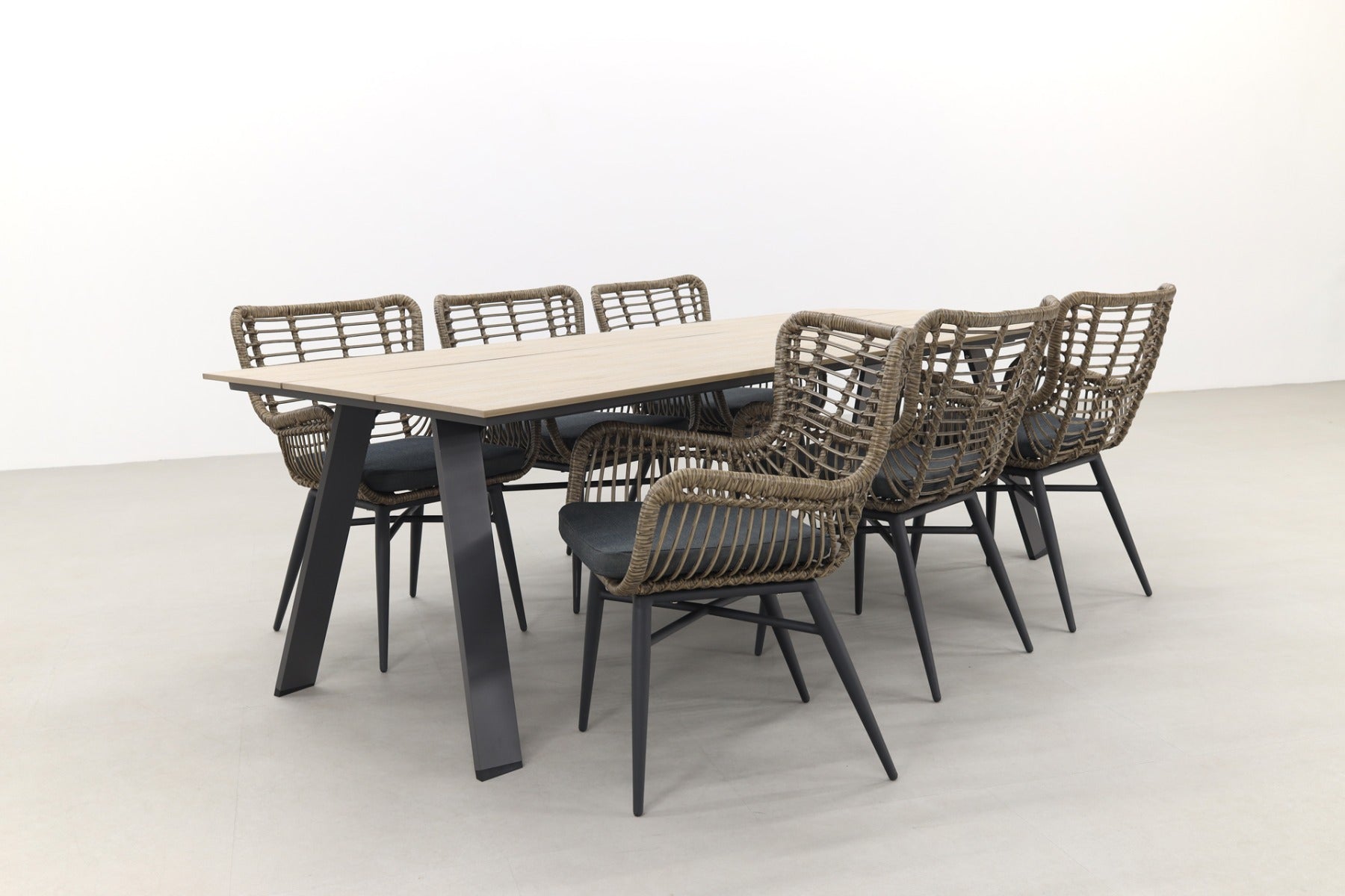 6x Jasmine wicker tuinstoel – natural 1x Nevada tuintafel 240 x 100 cm – carbon frame met light teak polywood blad