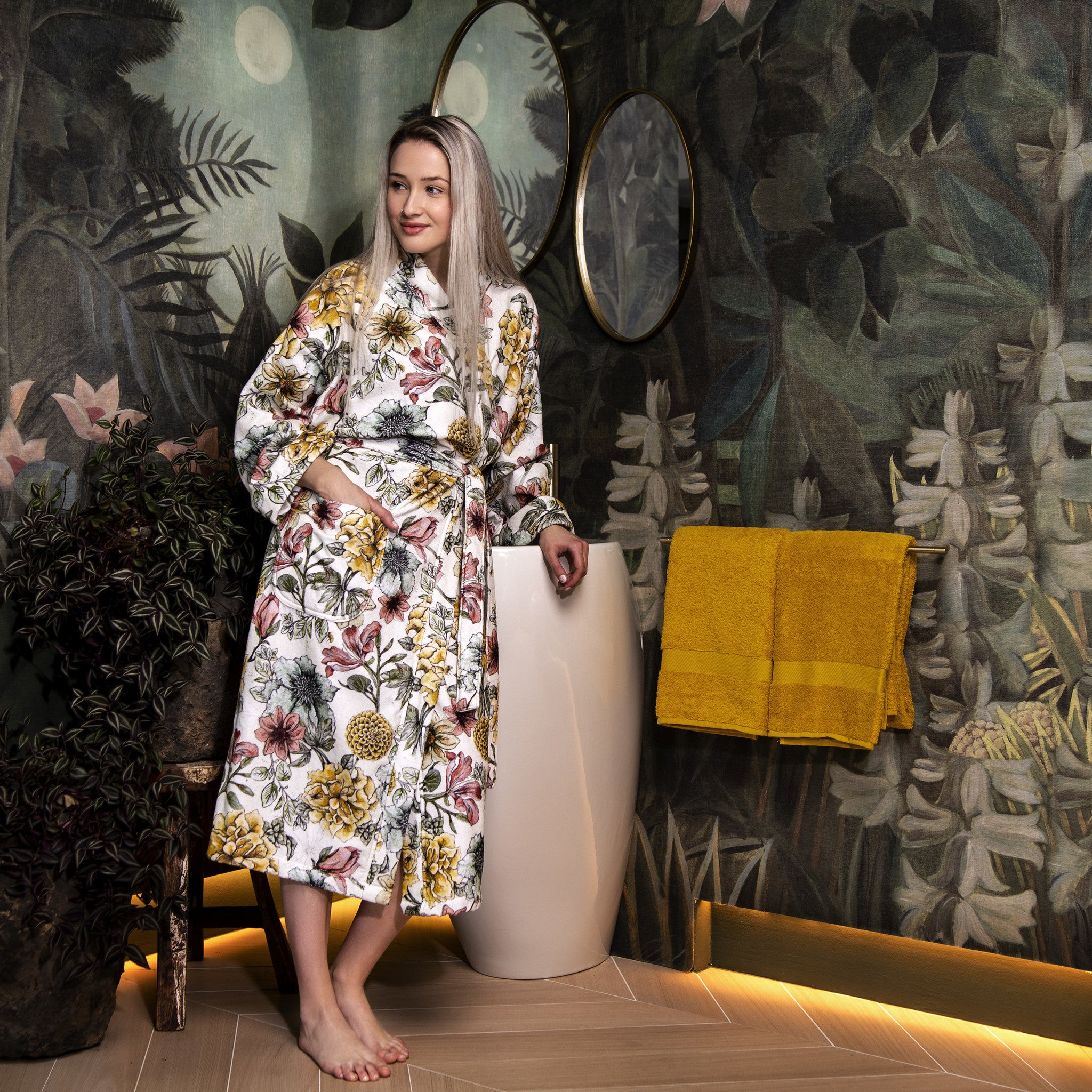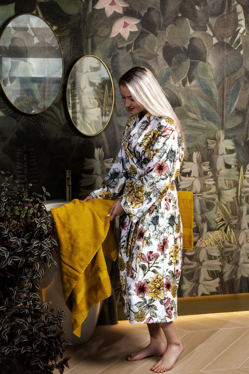 Wat de Yellow Touch badjas echt onderscheidt, is de prachtige bloemenprint. De levendige kleuren en het elegante ontwerp voegen een vleugje verfijning en persoonlijkheid toe aan jouw loungewear. Of je nu thuis ontspant of in een spa verblijft, deze badjas maakt indruk met zijn stijlvolle uitstraling. De bloemenprint is tijdloos en toch modern, waardoor de badjas een veelzijdige aanvulling is op je garderobe.