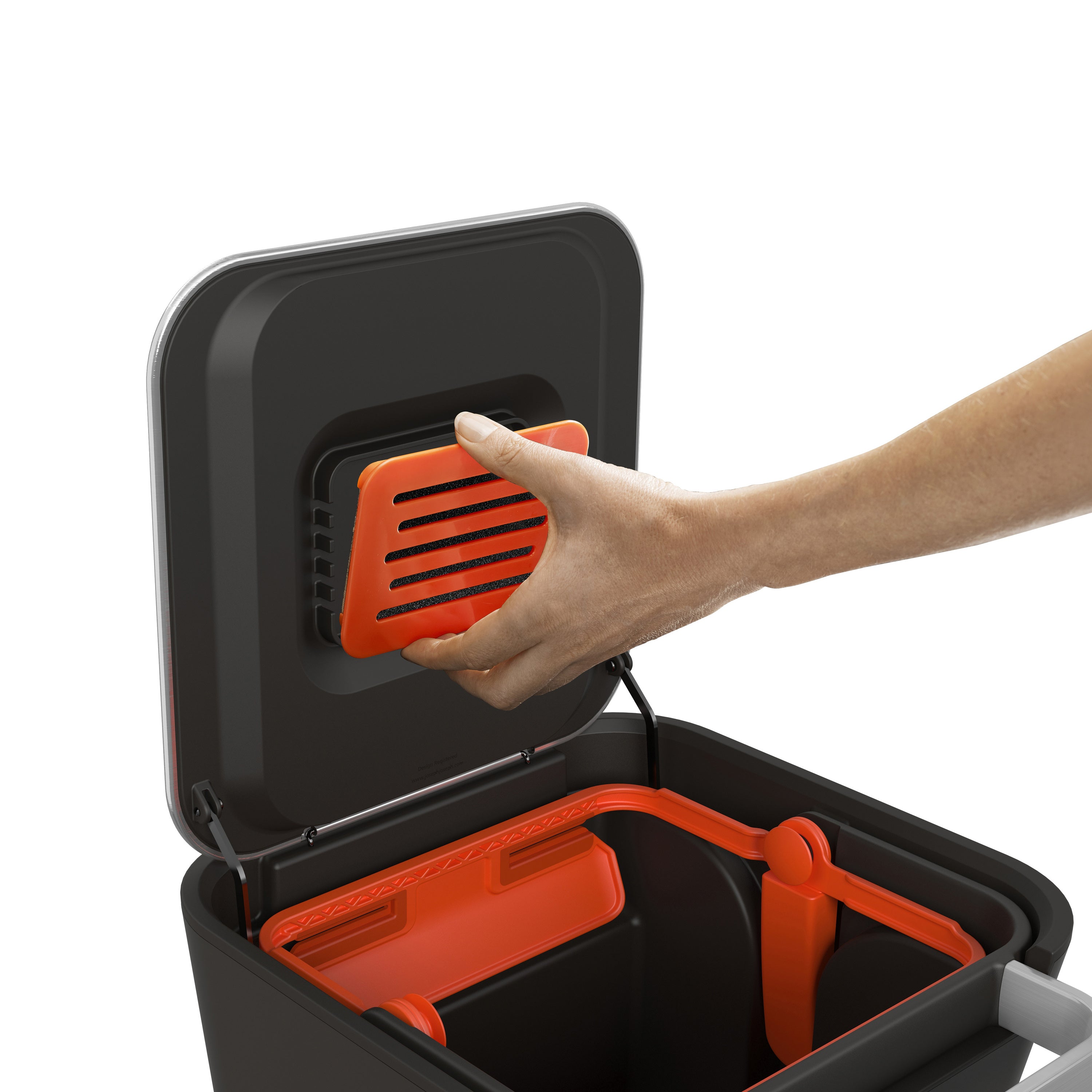 Aandrukken maar De pedaalemmer beschikt over een handig systeem waarmee je het vuilnis aanduwt en kleiner maakt. De hendel aan de voorkant van de pedaalemmer duw je eerst omhoog, zodat deze in het midden van de opening staat, en vervolgens naar beneden. Op deze manier druk je het vuil samen en past er tot wel drie keer meer afval in de afvalemmer.