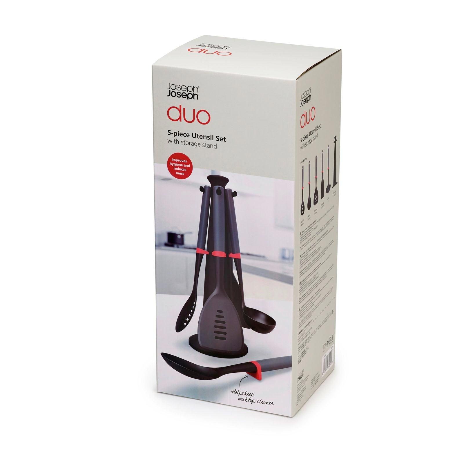 Met de keukenhulpenset van Joseph Joseph Duo houd jij jouw alledaagse keukengerei binnen handbereik! Deze compacte set bestaat uit een carrousel met een soeplepel, lange spatel, gleufspatel, opscheplepel en een gleuflepel. Alle keukenhulpjes binnen deze set hebben een geïntegreerde leunstandaard waardoor je ze kan neerleggen zónder dat deze het aanrecht aanraken. Dankzij de nylon koppen zijn deze hulpjes geschikt voor alle kookgerei met én zonder antiaanbaklaag. De set is hittebestendig tot 200°C en kan na gebruik eenvoudig gereinigd worden in de vaatwasser.